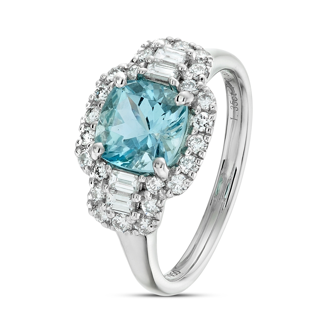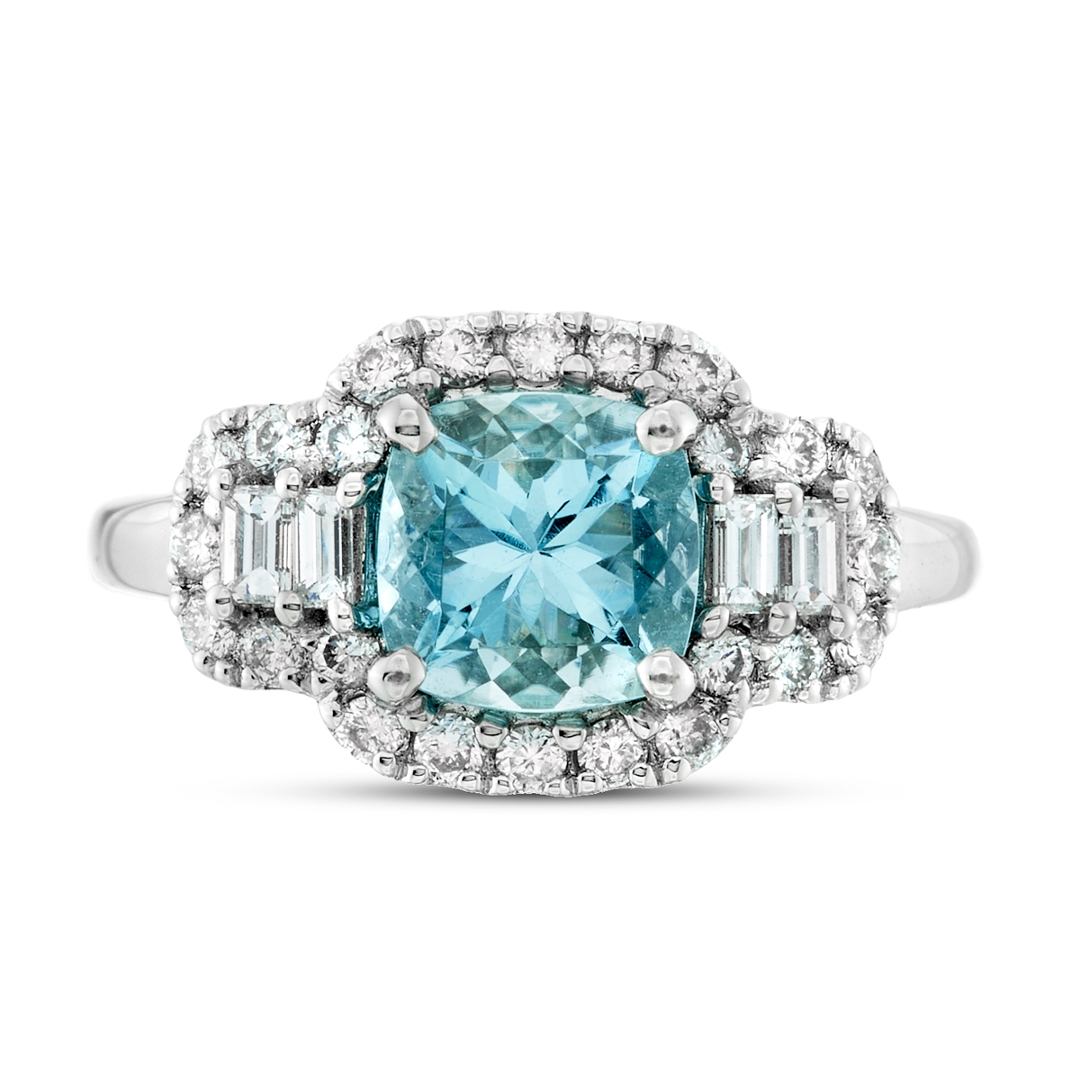 - > Natural Aquamarine 1.35ct & Diamond 0.55ct Cushion Shaped Cluster Ring