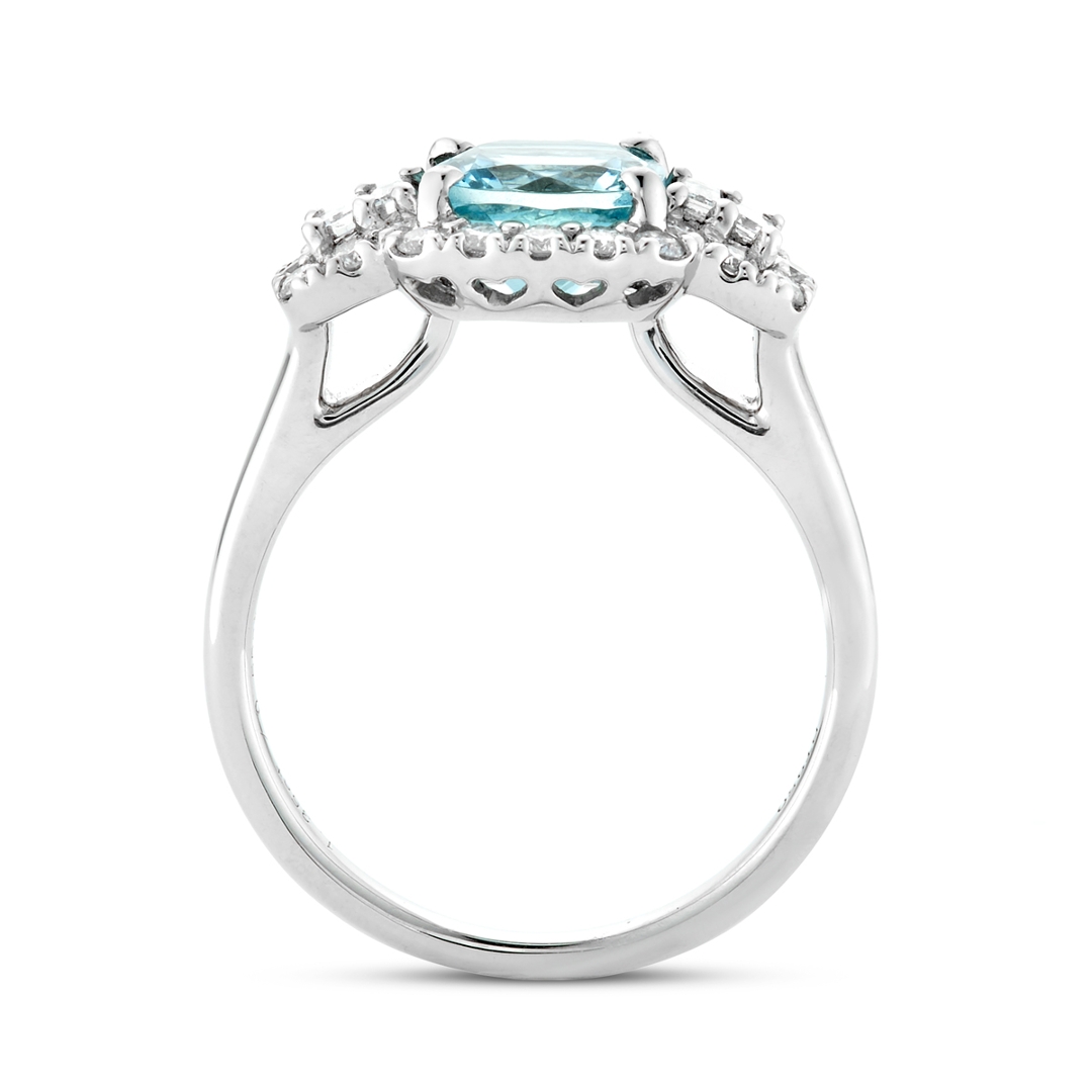 A brand-new, unused certified natural diamond and aquamarine cluster ring that exudes sophistication and timeless elegance. At its centre rests a 1.35-carat cushion step-cut aquamarine, displaying a delicate pale-blue hue with exceptional clarity and luminosity. Framing the central gemstone is a striking combination of baguette-cut and brilliant-cut natural diamonds, forming a radiant halo that continues along the shoulders to create a captivating display of light and depth. The diamonds, totalling 0.55 carats, are graded G–H in colour and VS2–SI1 in clarity, offering superb brilliance that perfectly complements the aquamarine’s calm, ethereal tone.