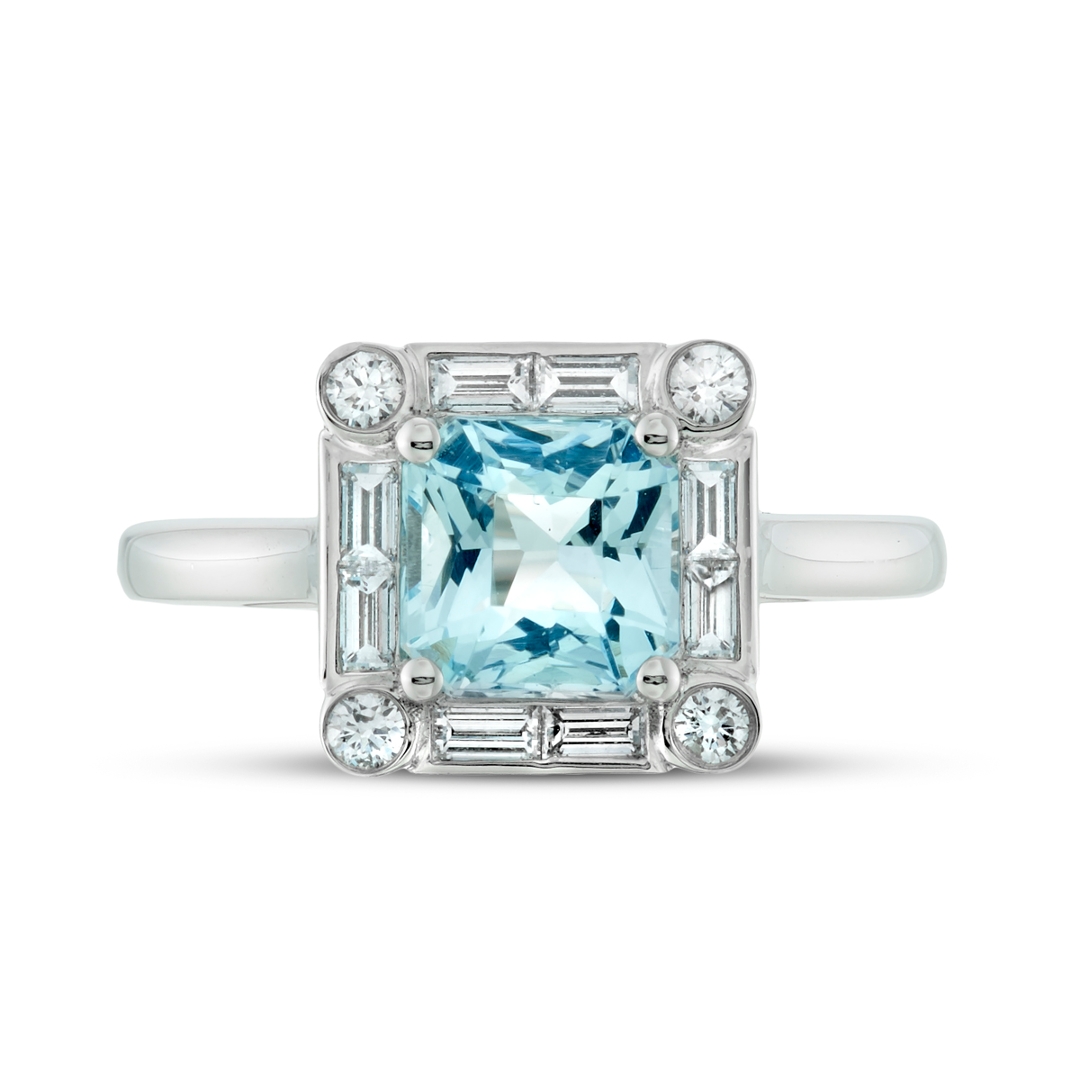 - > Natural Aquamarine 1.44ct & Diamond 0.42ct Princess Shaped Cluster Ring