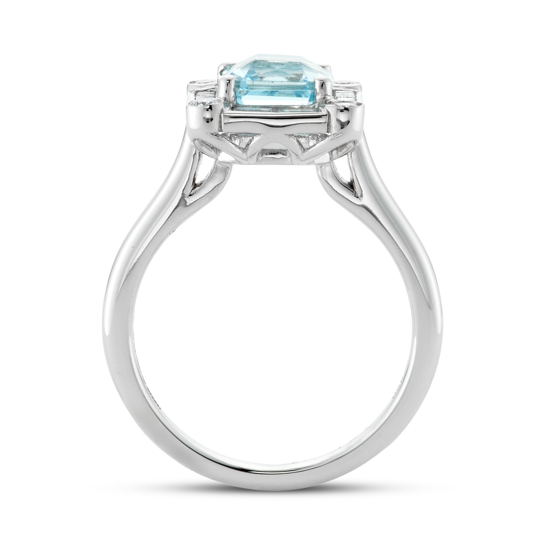 A brand-new, unused, certified natural diamond & aquamarine princess-shaped cluster ring, with one octagonal mixed-cut aquamarine gemstone to the centre & a cluster of brilliant-cut & baguette-cut diamonds in a halo setting, set in platinum.