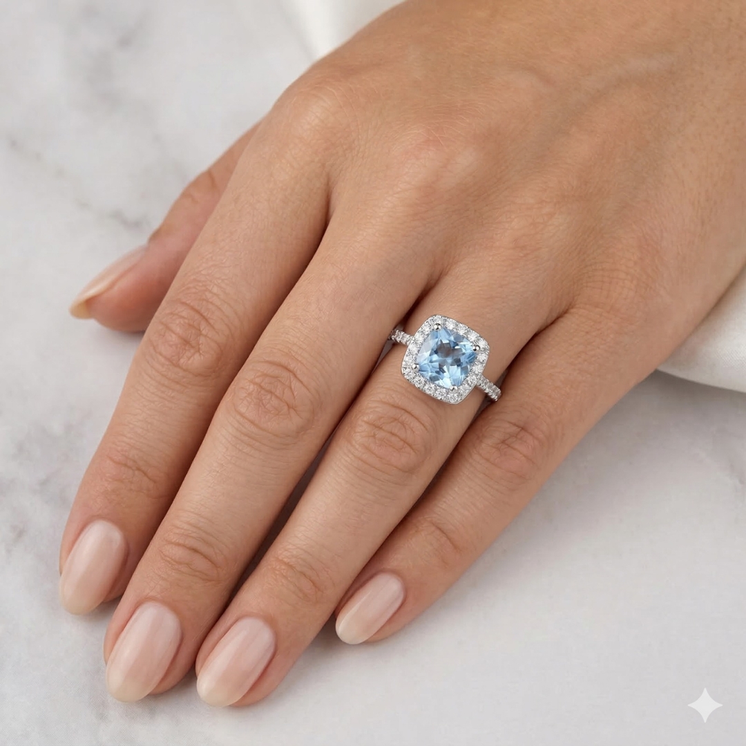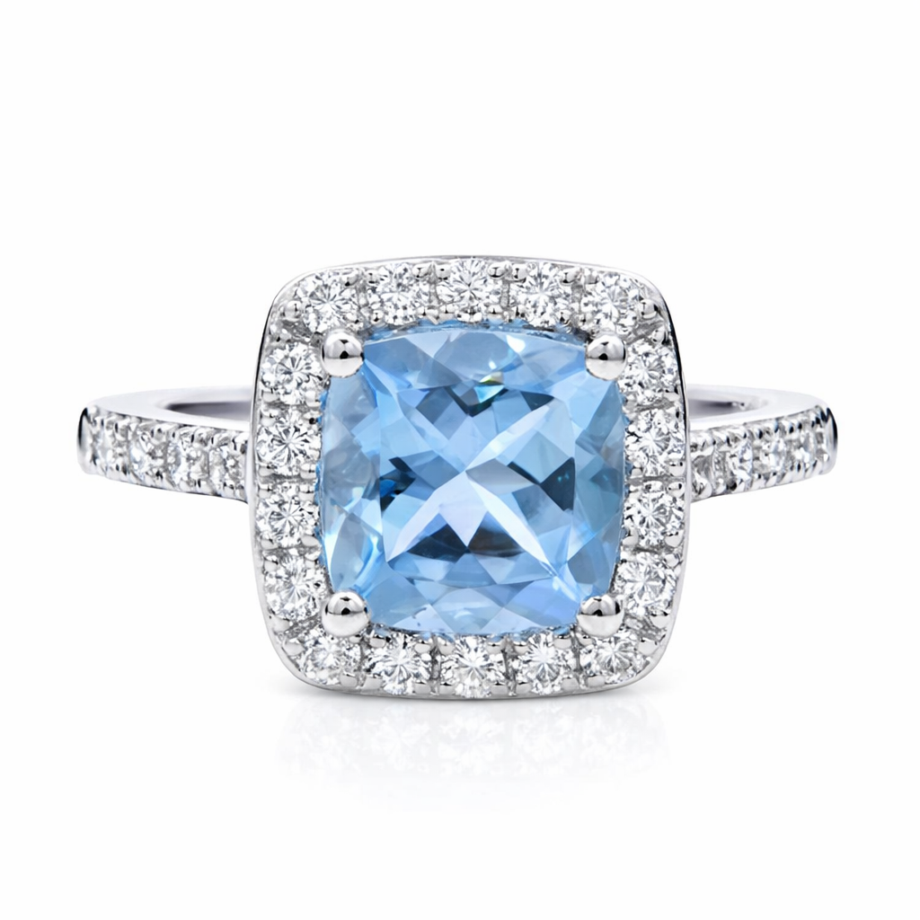 - > Natural Aquamarine 1.46ct & Diamond 0.48ct Cushion Shaped Cluster Ring
