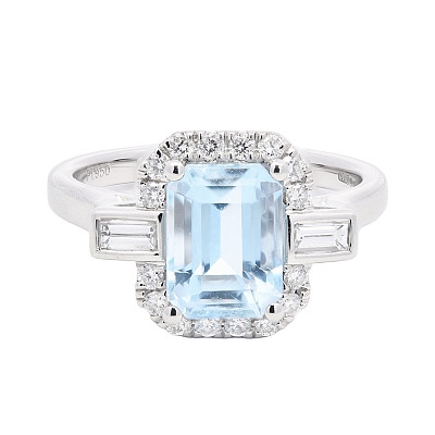 A brand-new, unused, certified natural diamond & aquamarine emerald-shaped cluster ring, set with one emerald-cut aquamarine gemstone at the centre, two baguette-cut diamonds to the sides & a cluster of brilliant-cut diamonds in a halo setting, set in platinum.