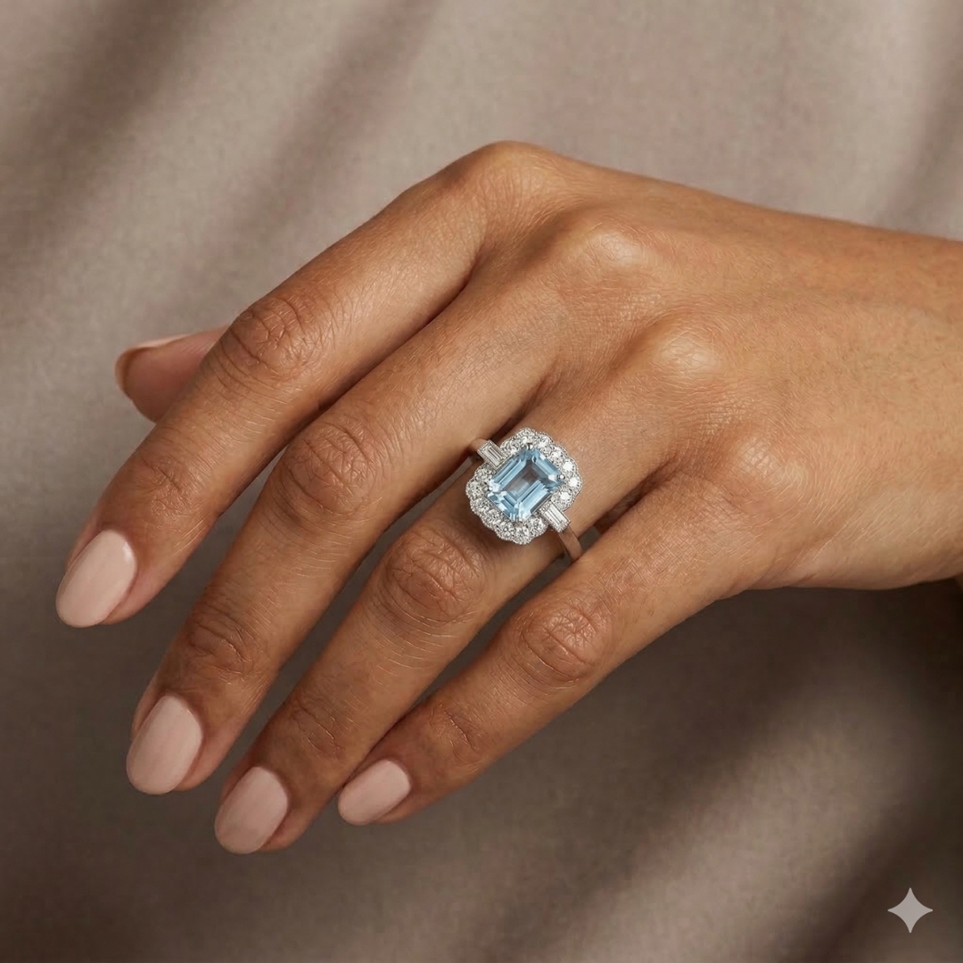 Flanking the centre gemstone are two baguette-cut natural diamonds, adding structure and elegance to the overall composition. Surrounding the aquamarine is a halo of brilliant-cut diamonds, with additional brilliant-cut diamonds extending along the shoulders to enhance the ring’s sparkle and visual depth. These diamonds have a combined total weight of 0.43ct, producing lively flashes of light that beautifully complement the aquamarine's calm blue tone. Natural diamonds are widely admired for their rarity, durability and enduring prestige within the world of fine jewellery.