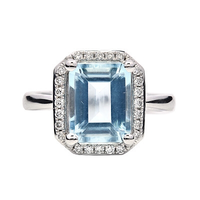 A brand-new, unused, certified natural diamond & aquamarine gemstone cluster ring, set with one emerald-cut aquamarine gemstone at the centre & a cluster of brilliant-cut diamonds in a halo setting, set in platinum.