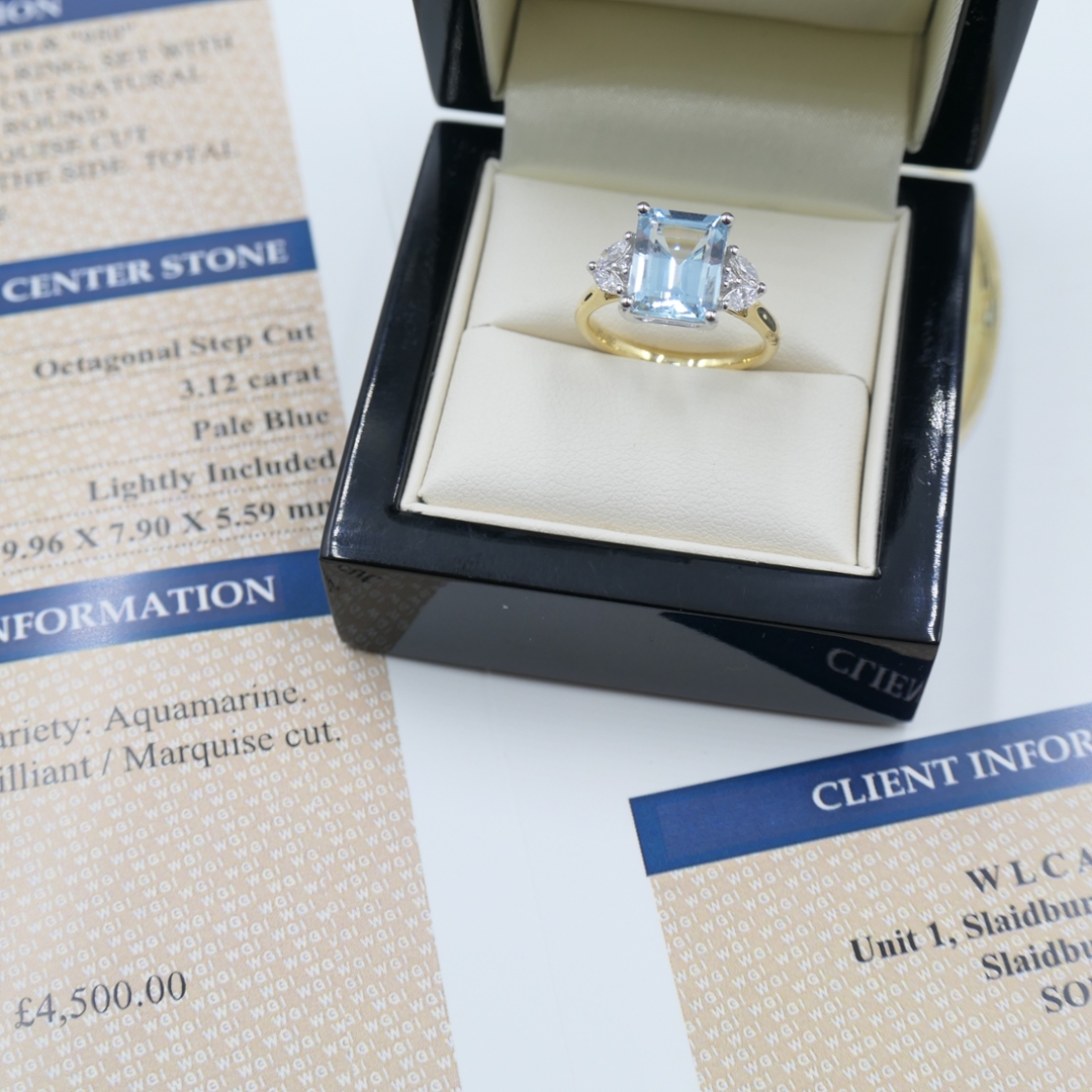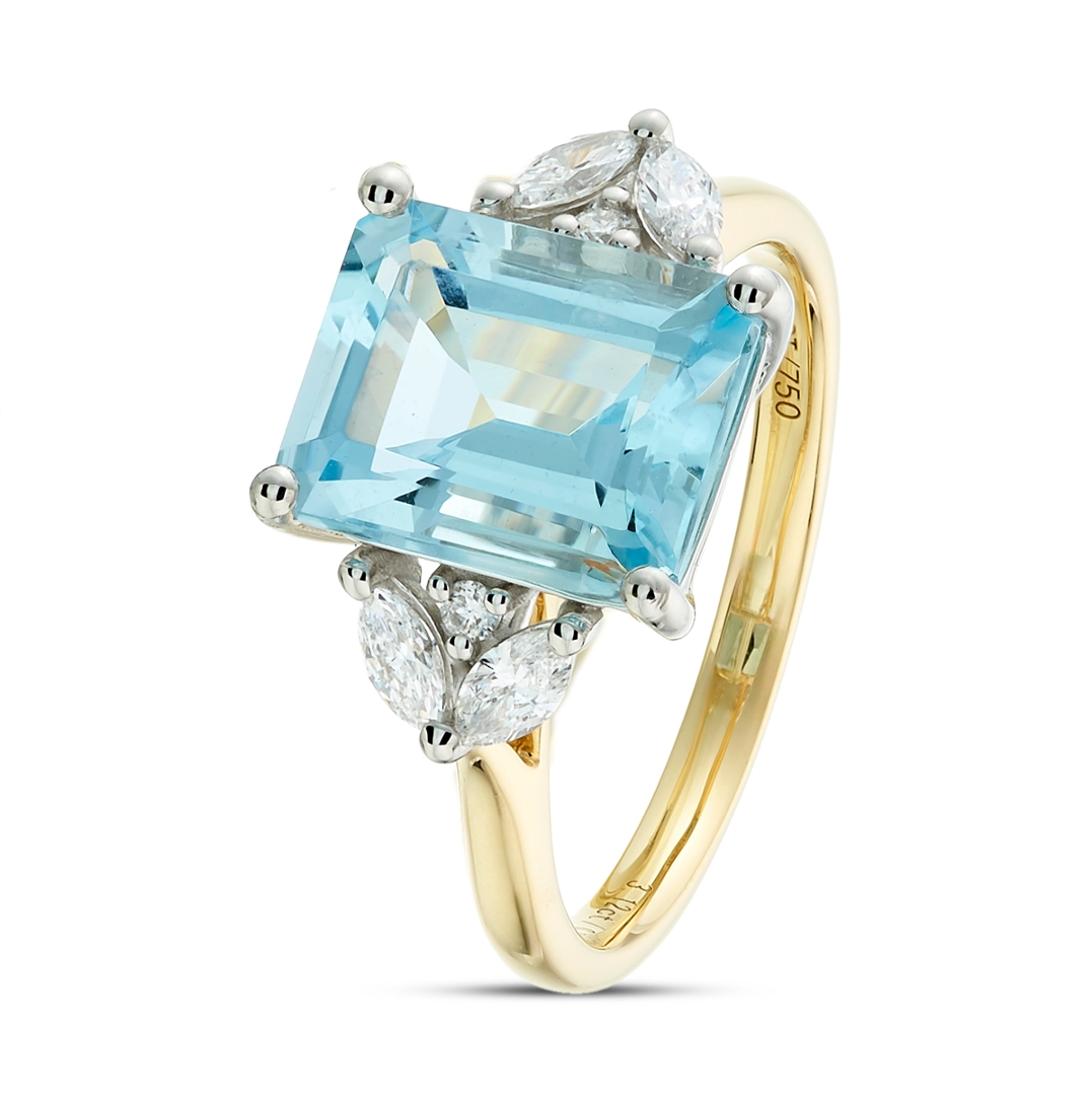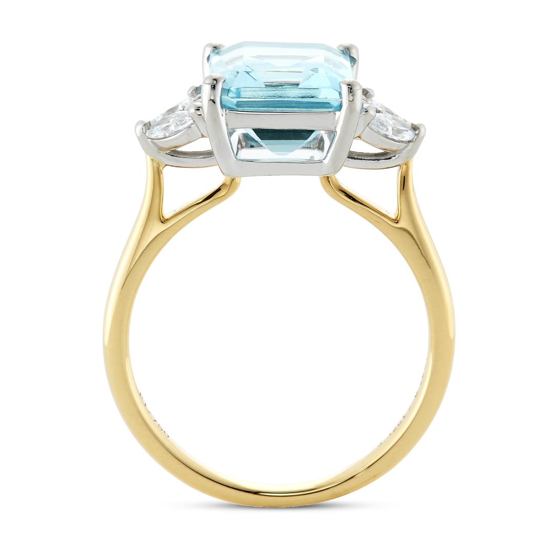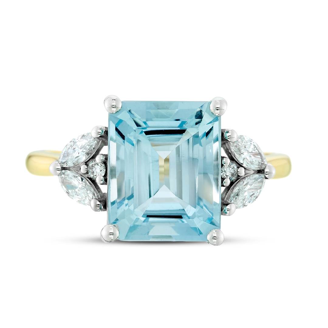 Beautifully crafted in platinum and 18-carat yellow gold, this ring weighs 4.71 grams and showcases an exceptional blend of cool modernity and warm classic style. The platinum setting enhances the aquamarine’s light-catching clarity, while the yellow gold detailing adds a hint of richness and depth to the overall design. Every gemstone is securely and precisely set, reflecting true fine jewellery craftsmanship.