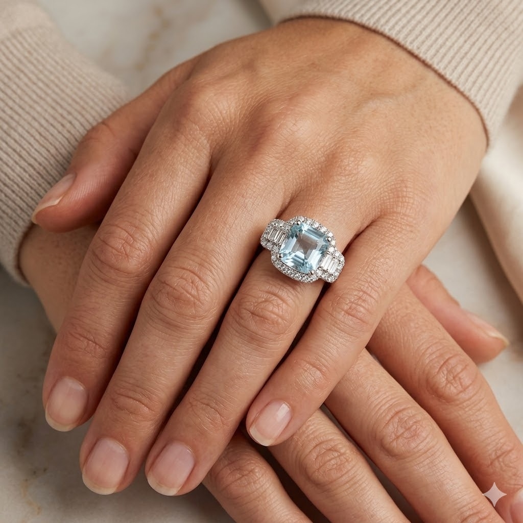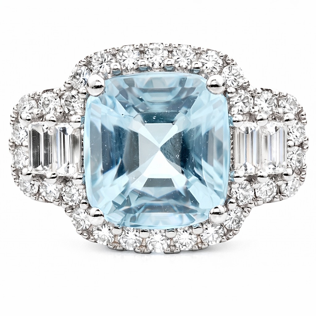 A brand-new, unused certified natural aquamarine and diamond cluster ring featuring a 3.91ct cushion-cut aquamarine at the centre, framed by four baguette-cut diamonds to the sides and a halo of brilliant-cut diamonds, all set in platinum. The calm blue tone of the aquamarine brings a serene, luminous quality that contrasts beautifully with the crisp sparkle of the surrounding natural diamonds. Their 0.79ct combined weight adds structure and precision, with the baguette cuts introducing clean, linear flashes while the brilliant-cut halo provides lively scintillation from every angle. Natural diamonds continue to be admired for their rarity, authenticity and unique internal character, and their presence in this design enhances the aquamarine’s clarity and colour while reinforcing the ring’s overall sense of refinement.
