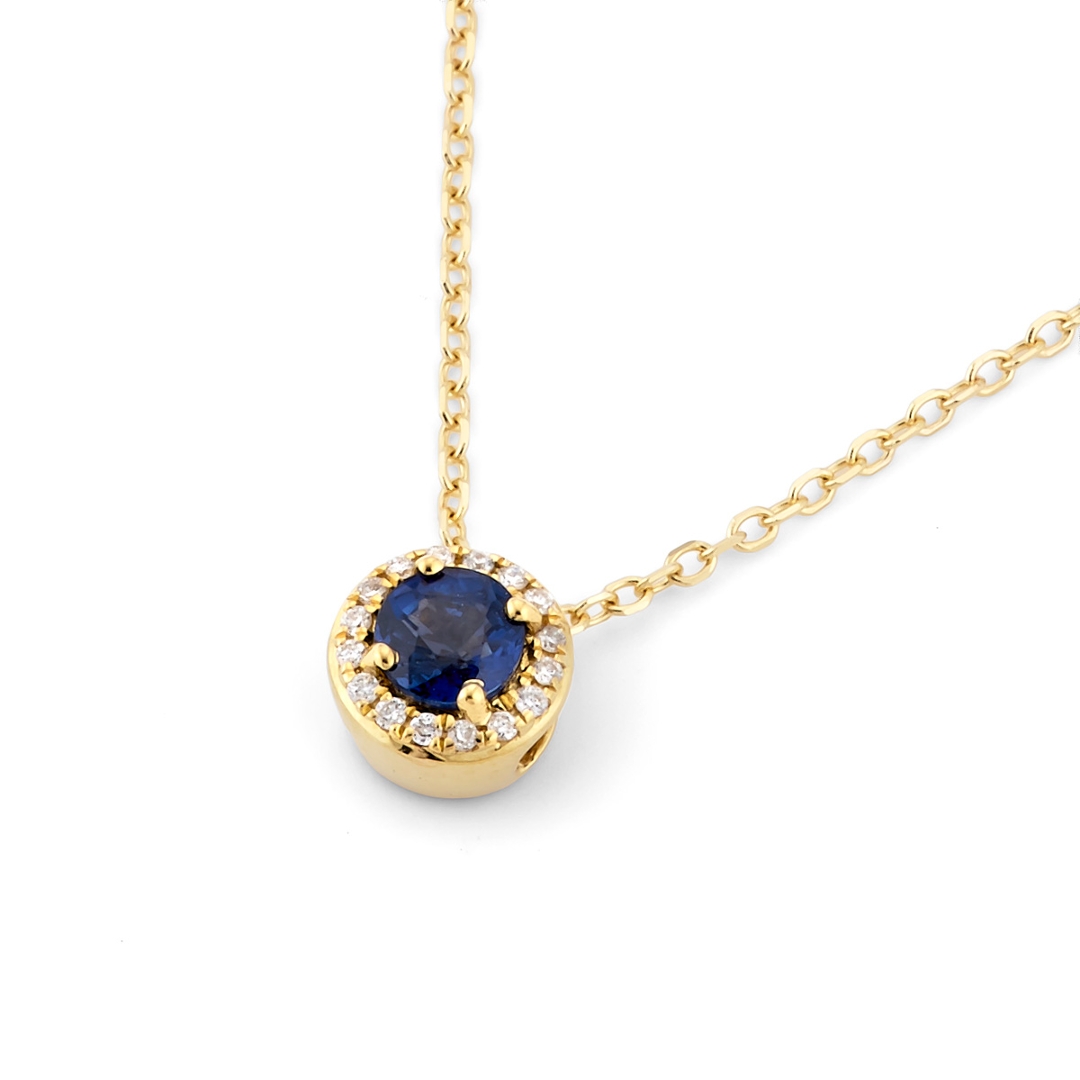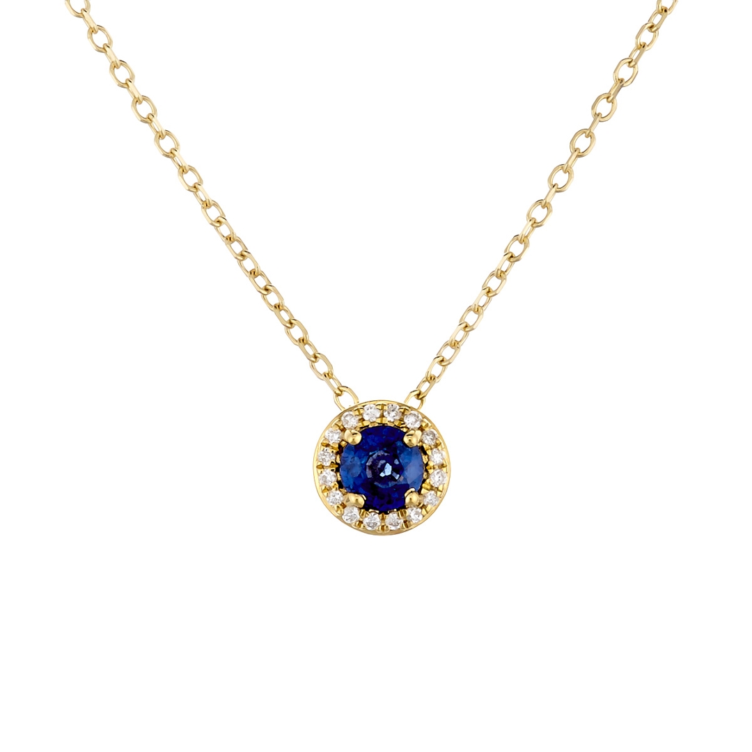 A brand-new, unused, certified natural diamond & blue sapphire gemstone round-shaped cluster pendant, with one round mixed-cut blue sapphire gemstone & a cluster of brilliant-cut diamonds, set in 18ct yellow gold.