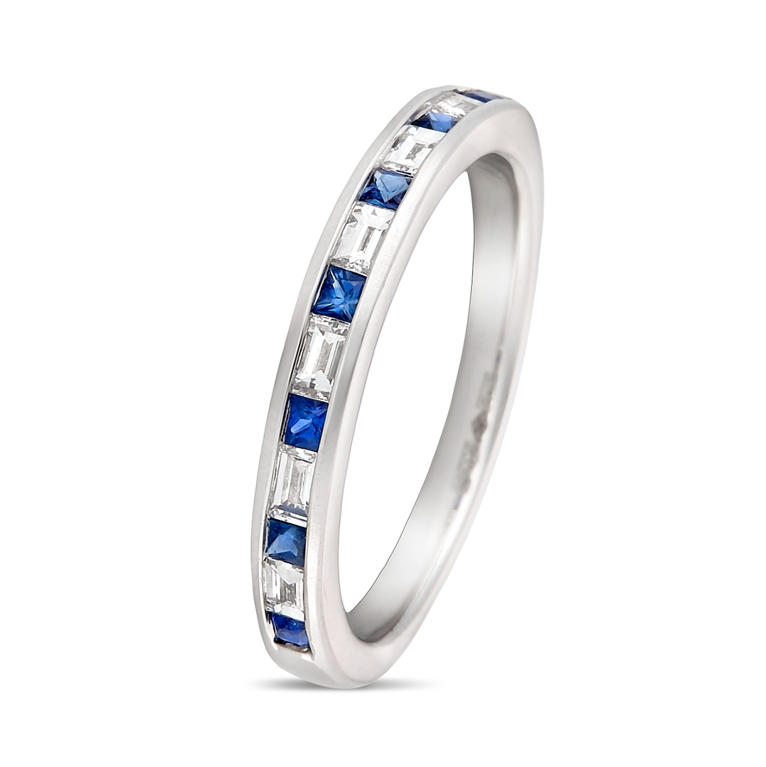 A brand-new, unused eternity ring crafted in certified platinum, this refined piece is set with seven square mixed-cut natural blue sapphires and six baguette-cut natural diamonds. The sapphires, weighing a total of 0.27ct, display a striking blue hue that symbolises depth and elegance, while the diamonds, weighing 0.33ct, are graded F–G in colour with SI1–SI2 clarity, offering crisp brilliance that contrasts beautifully against the richness of the sapphires. The combination of step-cut precision and smooth platinum gives the design a sleek and timeless character.