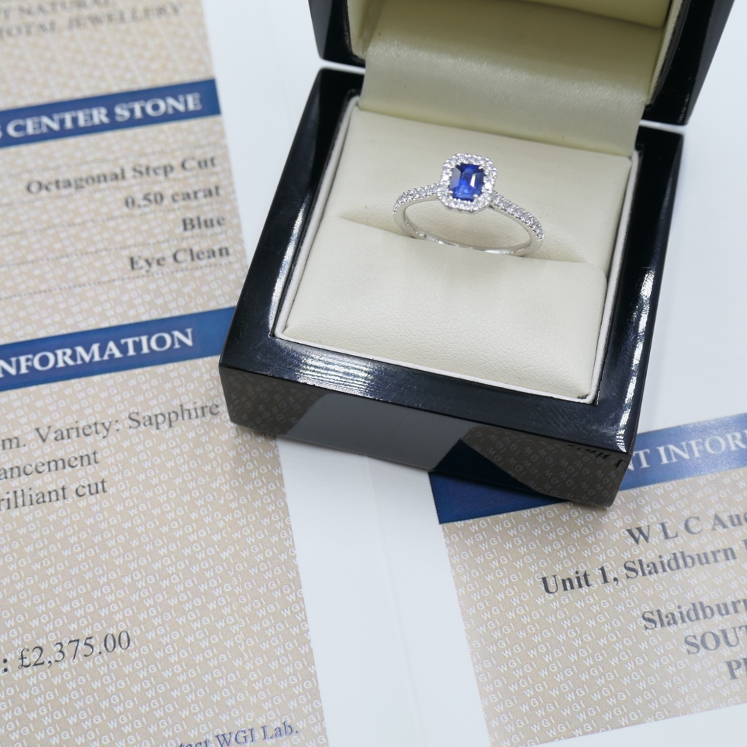 - > Natural Blue Sapphire 0.50ct & Diamond 0.33ct Asscher Shaped Cluster Ring