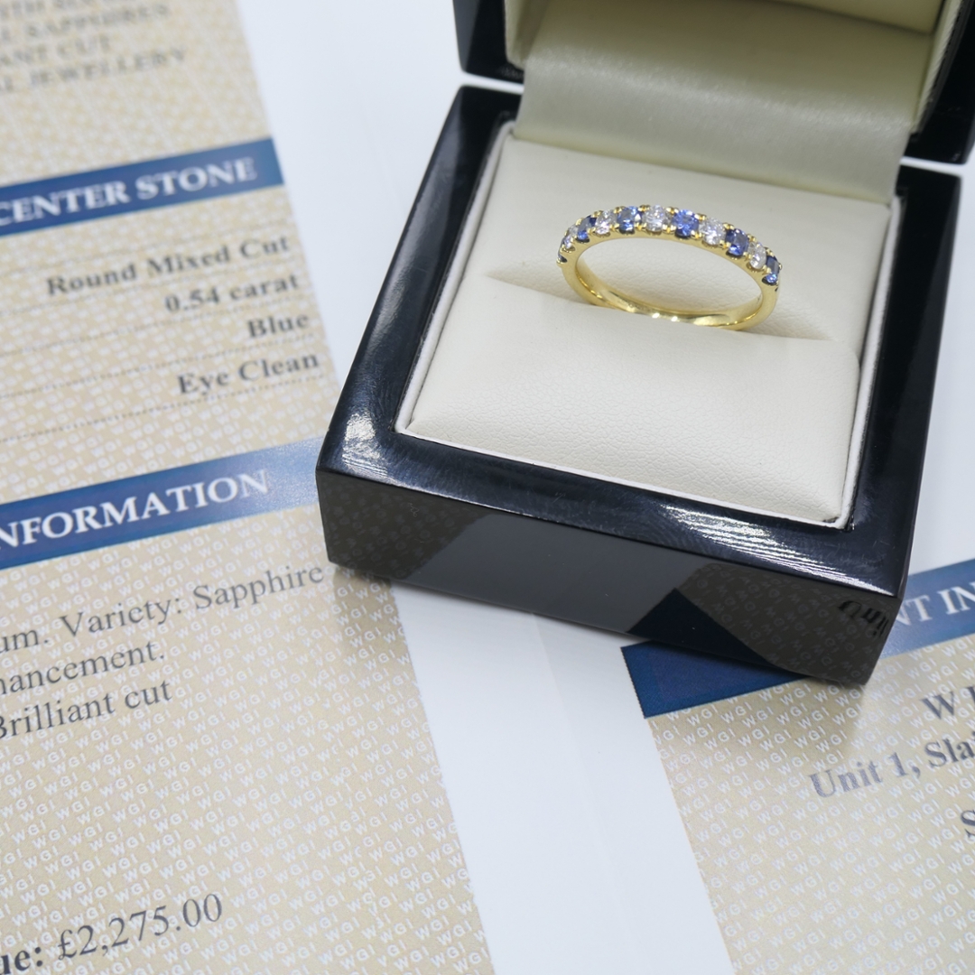 A brand-new, unused certified 18ct yellow gold eternity ring, this exquisite piece beautifully blends the richness of blue sapphires and diamonds. Set with six round mixed-cut blue sapphires, totalling 0.54ct, the vibrant blue of the sapphires creates an eye-catching display of colour, adding an elegant pop to the design. The ring is further enhanced by five brilliant-cut diamonds, totalling 0.33ct, which radiate with a captivating sparkle, making the piece truly stand out.