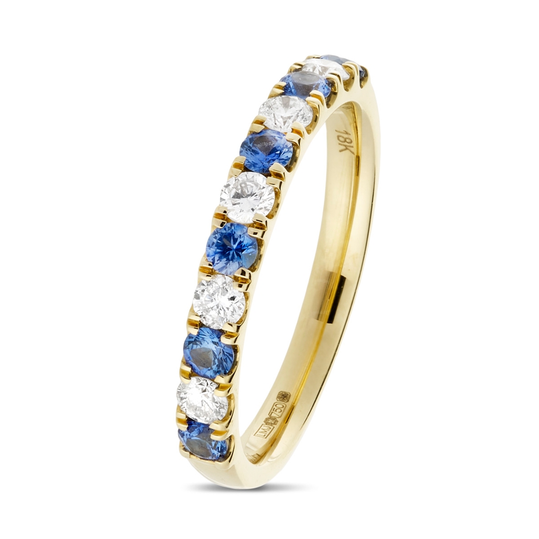 A brand new, unused, certified natural diamond & blue sapphire gemstone eternity ring, set with six round mixed cut blue sapphire gemstones & five brilliant cut diamonds, set in 18ct yellow gold.