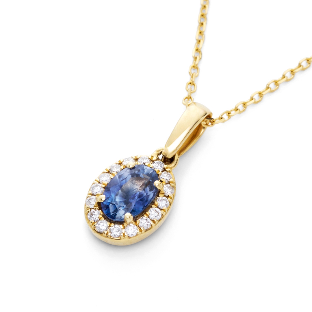 A brand-new, unused, certified natural diamond & blue sapphire oval-shaped cluster pendant, with one oval mixed-cut blue sapphire gemstone at the centre & a cluster of brilliant-cut diamonds in a halo setting, in 18ct yellow gold.