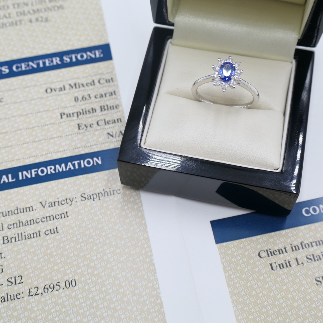 A brand-new, unused certified natural diamond and blue sapphire gemstone cluster ring that beautifully combines classic sophistication with timeless charm. At its centre lies a captivating 0.63-carat oval-cut blue sapphire, displaying an alluring purplish-blue hue that symbolises wisdom, loyalty, and serenity. Its natural origin ensures a depth of colour and brilliance that cannot be replicated, making it a truly enchanting focal point. Surrounding the sapphire is a radiant halo of brilliant-cut natural diamonds totalling 0.35 carats, graded F–G in colour and SI1–SI2 in clarity, adding mesmerising sparkle and enhancing the sapphire’s vibrant tone with remarkable precision and balance.