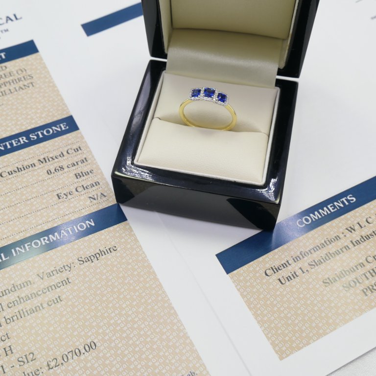 Surrounding the vibrant blue sapphires is a halo of brilliant-cut diamonds totalling 0.08 carats. These diamonds are expertly set in a cluster arrangement, enhancing the allure of the centre stones while adding brilliance and sparkle to the entire ring. With a clarity grade of SI1-SI2 and a colour grade of G-H, these diamonds exhibit exceptional quality and radiance.