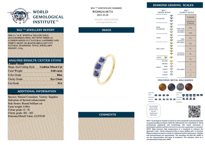 A brand new, unused, certified 18ct white & yellow gold natural diamond & blue sapphire gemstone cluster ring is a captivating and elegant piece of jewellery that exudes charm and sophistication. At its heart are cushion mixed-cut blue sapphire gemstones, totalling 0.68 carats. With their rich colour and alluring sparkle, these enchanting blue sapphires command attention and add a touch of regal beauty to the ring.