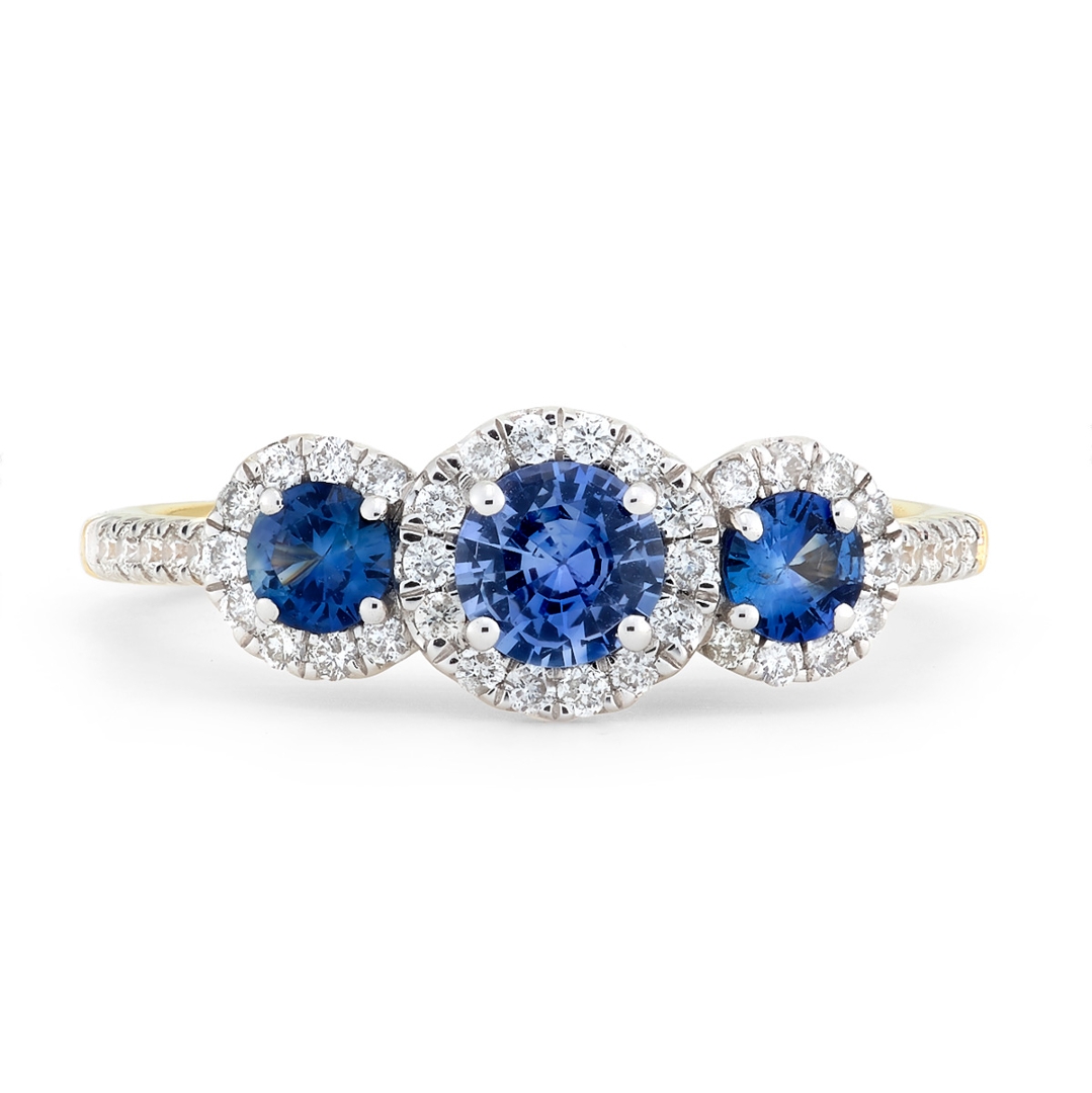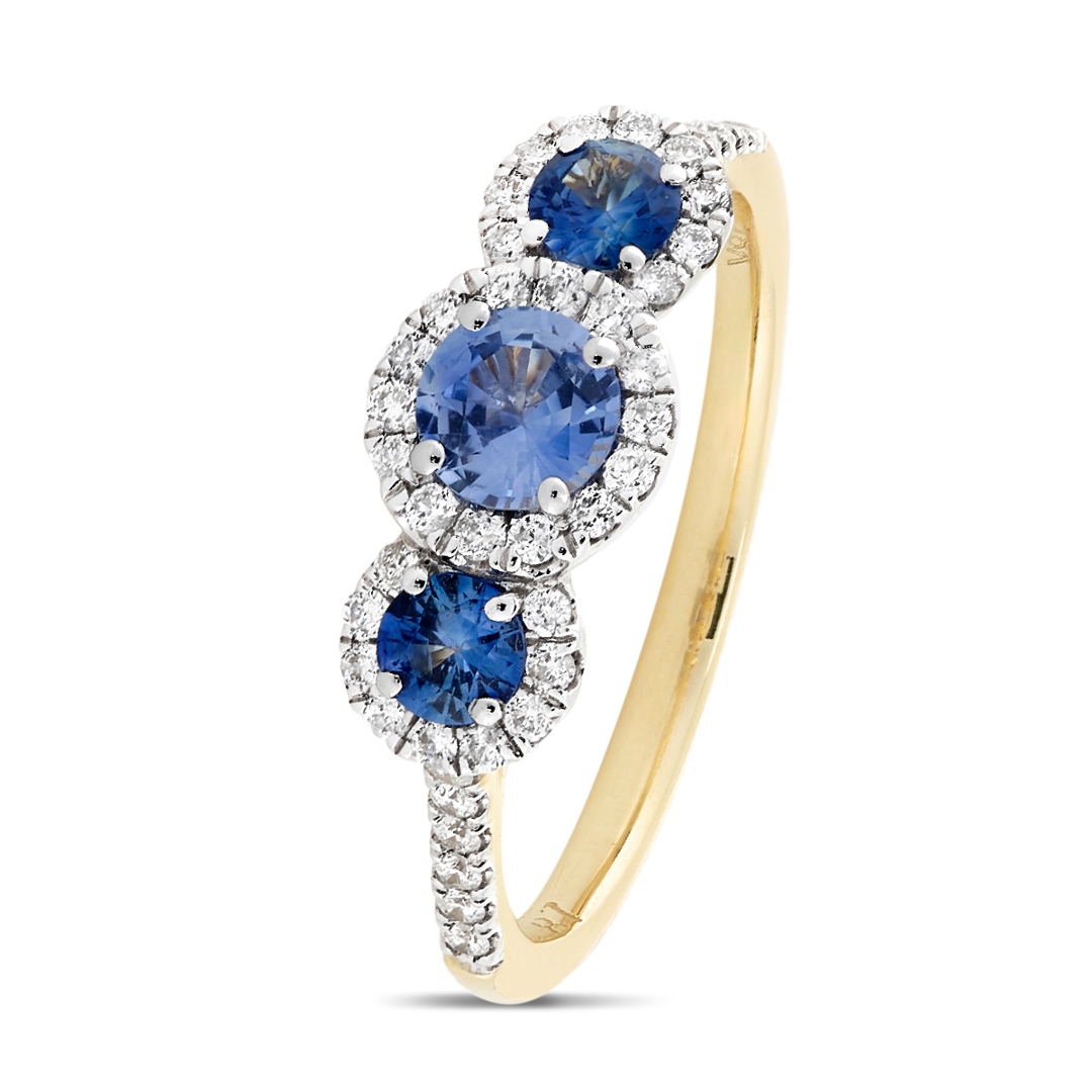 A brand new, unused, certified natural diamond & blue sapphire gemstone round-shaped trio cluster ring, set with three round mixed-cut blue sapphire gemstones to the centre & a cluster of brilliant-cut diamonds in a halo setting & to the shoulders, set in 18ct yellow & white gold.