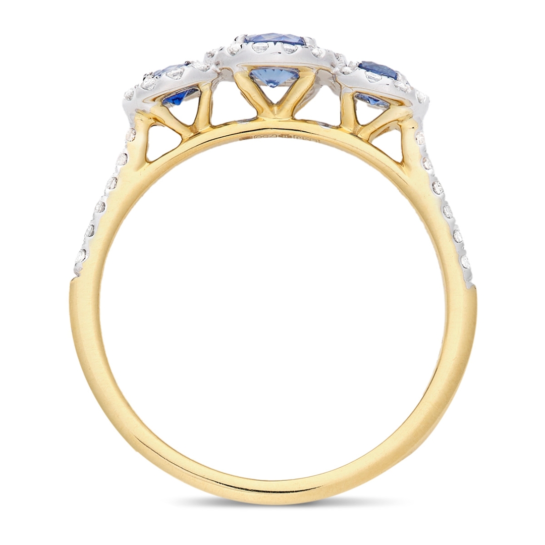 A brand-new, unused, certified natural diamond and blue sapphire round-shaped trio cluster ring that beautifully captures timeless design and refined colour. Crafted in 18ct yellow and white gold, this stunning piece features three round mixed-cut blue sapphire gemstones totalling 0.78 carats, displaying a light blue hue that glows with delicate radiance. Surrounding each sapphire is a halo of brilliant-cut natural diamonds that extends gracefully along the shoulders for a seamless sparkle. With a total diamond weight of 0.28 carats, graded G–H in colour and SI1–SI2 in clarity, each stone contributes to an elegant balance of light and vibrance, enhancing the sapphires’ cool, serene tone.