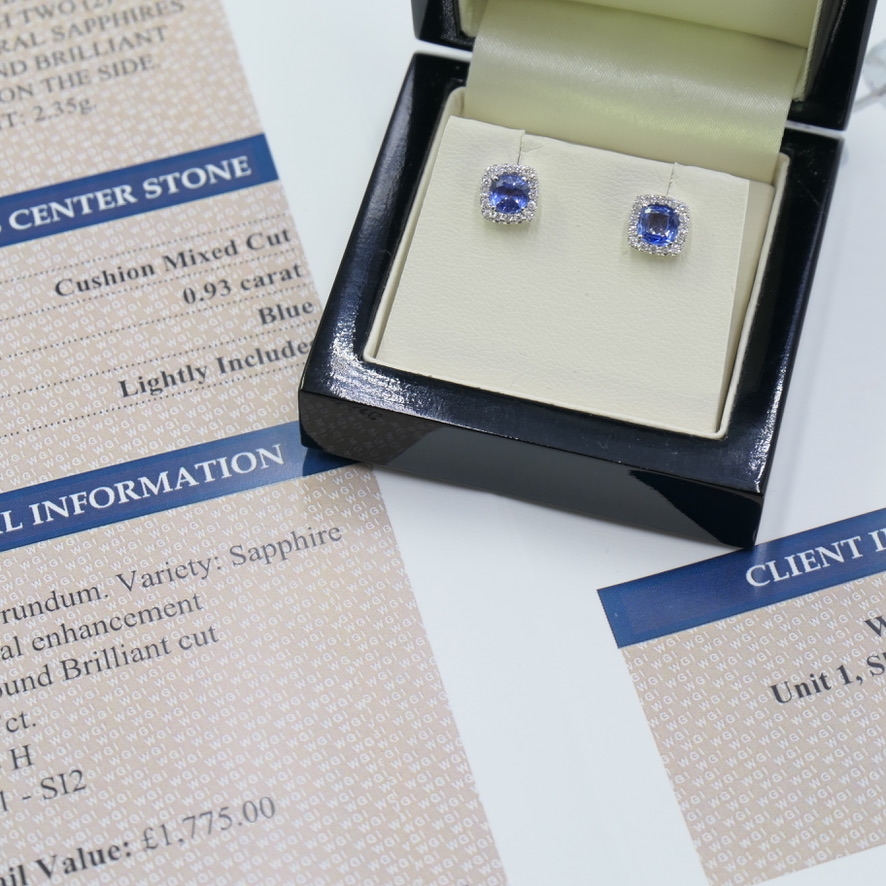 https://tinyurl.com/5ezswhxxA brand-new, unused certified pair of 18ct white gold diamond and blue sapphire cushion-shaped cluster earrings crafted with exquisite attention to detail. At the centre of each earring lies a stunning cushion-cut blue sapphire, weighing a combined 0.93ct. These captivating gemstones radiate a deep, velvety blue hue synonymous with sophistication and prestige. The sapphires are beautifully framed by a halo of brilliant-cut diamonds, meticulously set to enhance their brilliance and create a dazzling play of light.