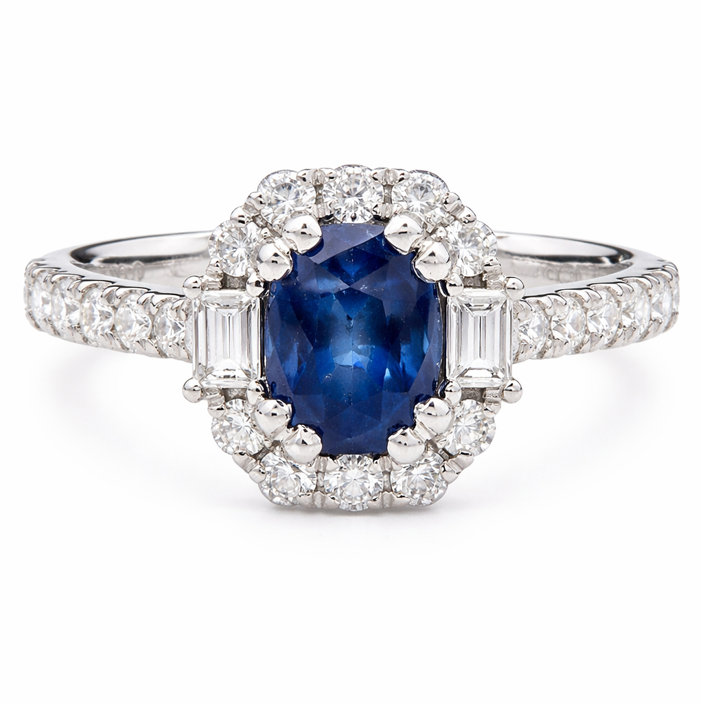Positioned to the sides of the centre stone are two baguette-cut natural diamonds, accompanied by a cluster of brilliant-cut diamonds that form a halo around the sapphire and extend gracefully along the shoulders. These diamonds have a combined weight of 0.55 ct, producing lively flashes of light that beautifully complement the deep blue centre gemstone. Natural diamonds are widely admired for their rarity, durability and enduring prestige, qualities that have ensured their lasting prominence in the world of luxury jewellery.