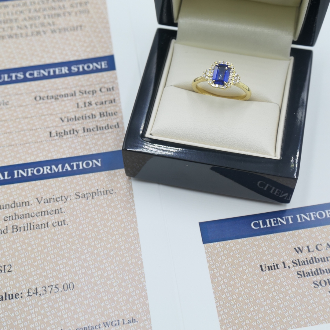 A brand-new, unused certified natural diamond and blue sapphire cluster ring that radiates timeless beauty, refinement and luxury. At its centre lies a captivating 1.18ct octagonal step-cut blue sapphire, displaying a striking violetish-blue hue that embodies depth, elegance and allure. Surrounding the centre stone is a delicate halo of brilliant-cut natural diamonds, totalling 0.17ct, graded G–H in colour and SI1–SI2 in clarity, adding a scintillating frame of light that enhances the sapphire’s rich tone. Expertly crafted in 18ct yellow gold, the warm glow of the metal beautifully complements the sapphire’s cool vibrancy, creating a perfect harmony of colour and brilliance. With a total weight of 4.01 grams and a professional valuation of £4,375, this ring exemplifies exceptional craftsmanship and classic sophistication.