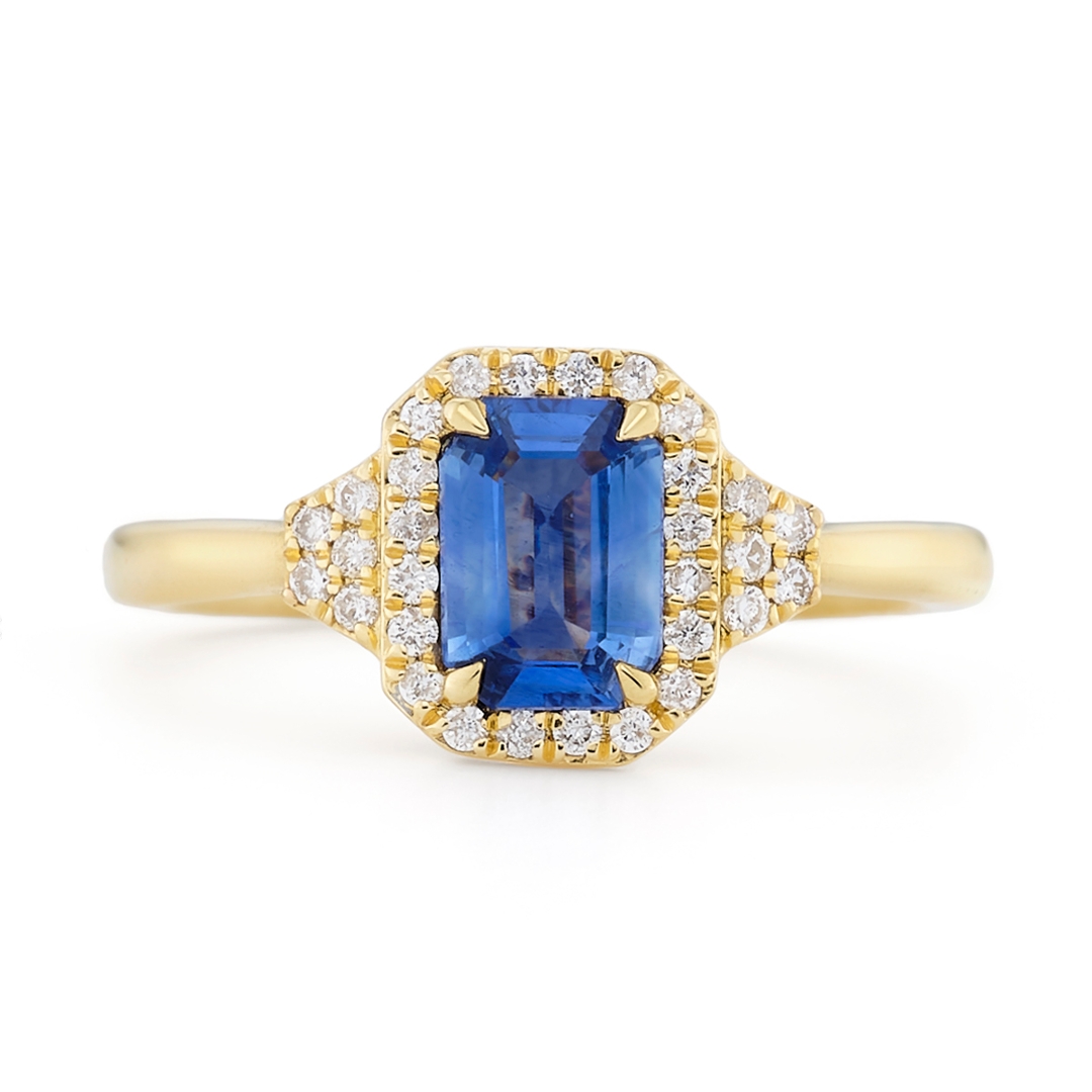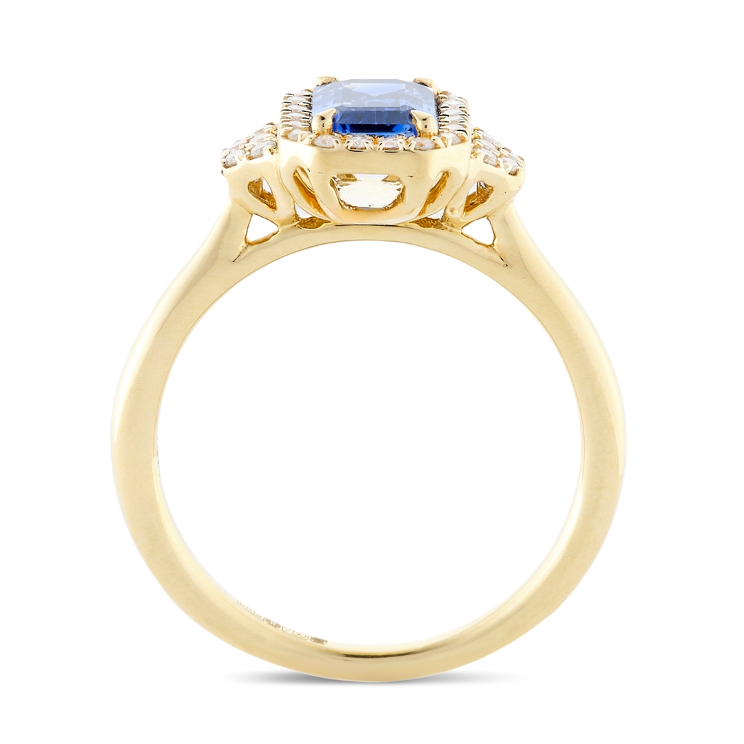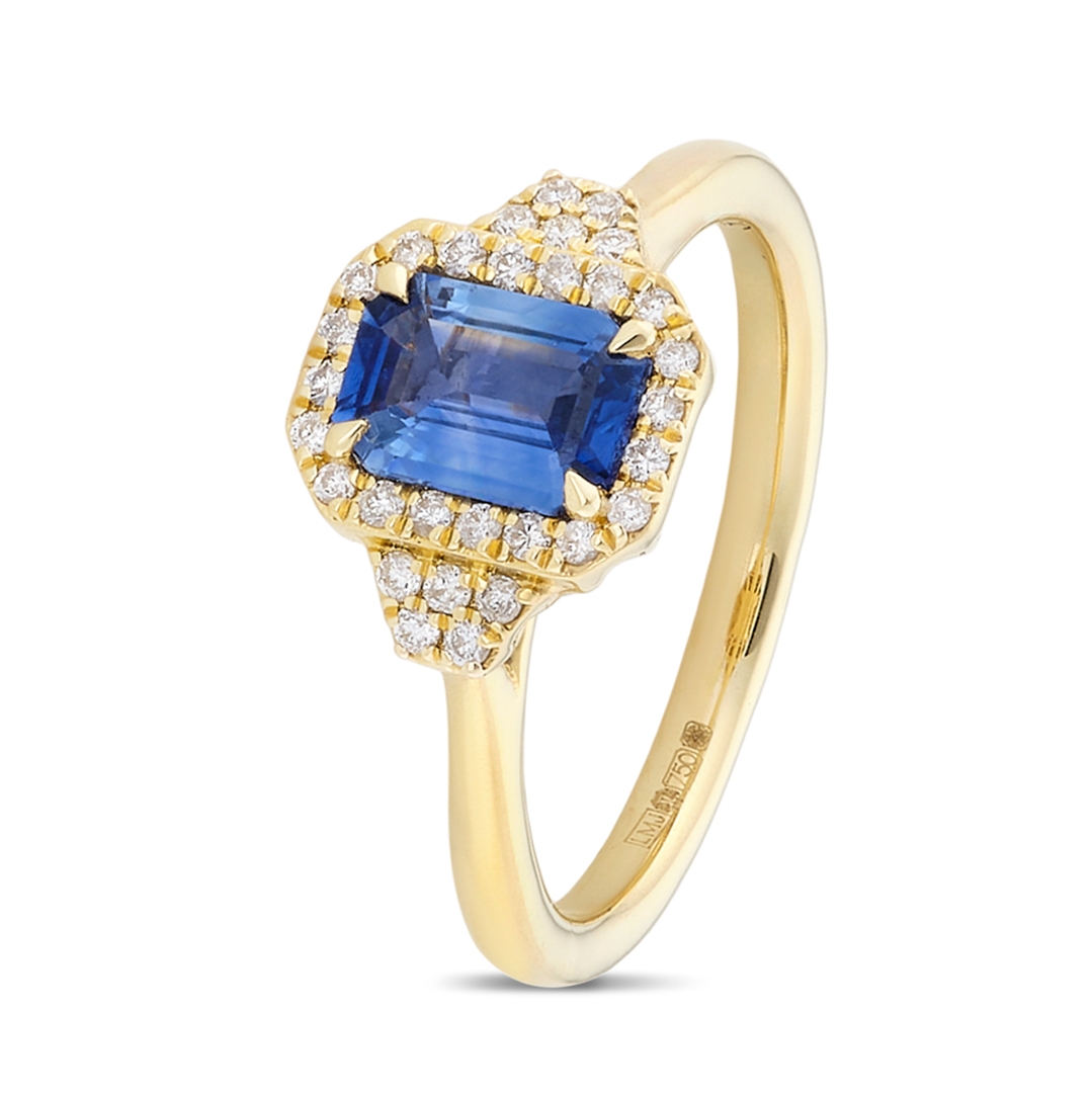 A brand-new, unused, certified natural diamond & blue sapphire gemstone cluster ring, with one octagonal step-cut blue sapphire gemstone to the centre & a cluster of brilliant-cut diamonds in a halo setting, set in 18ct yellow gold.