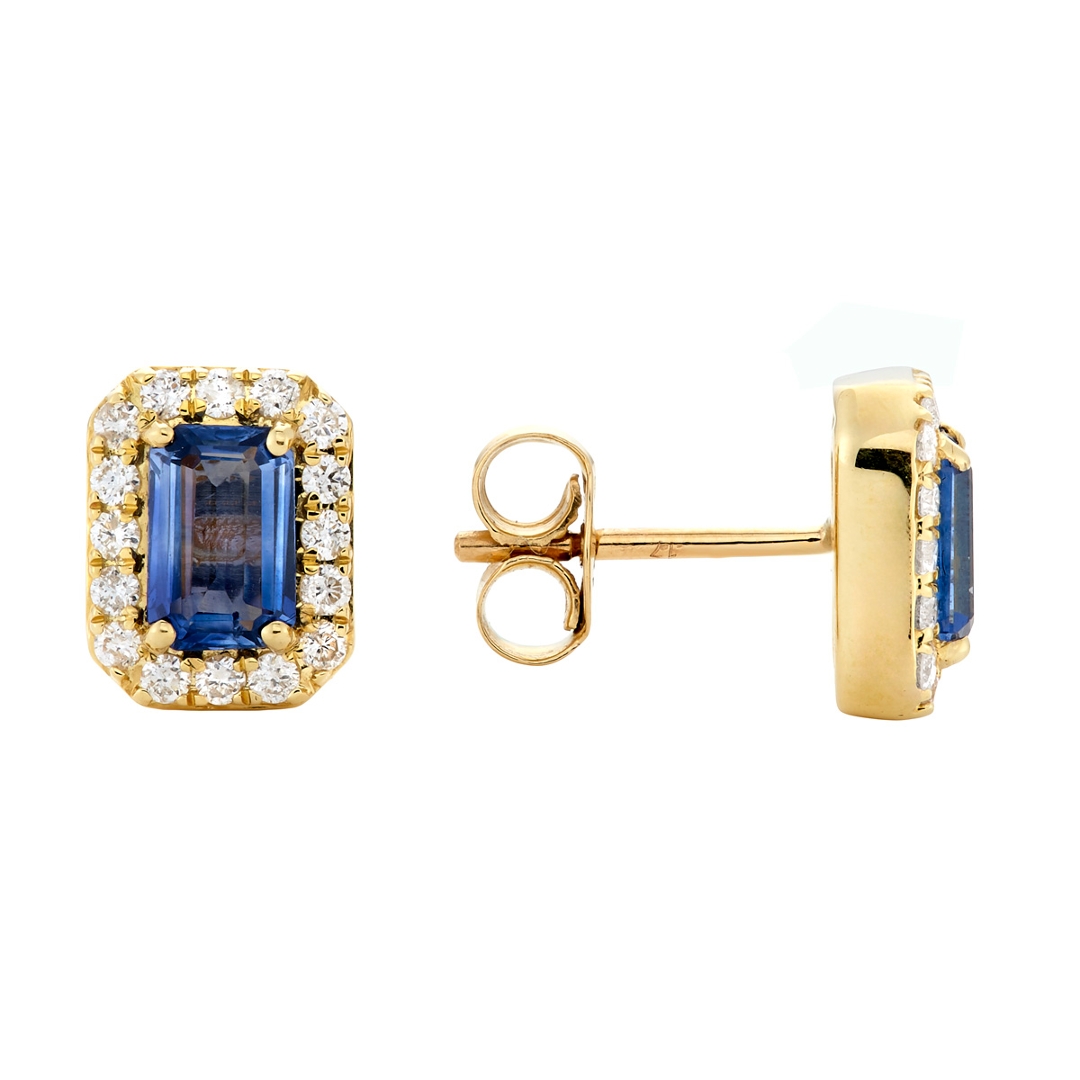 A brand-new, unused, certified pair of natural diamond & blue sapphire gemstone emerald-shaped cluster earrings, with two octagonal-step cut blue sapphire gemstones & a cluster of brilliant cut diamonds, set in 18ct yellow gold.