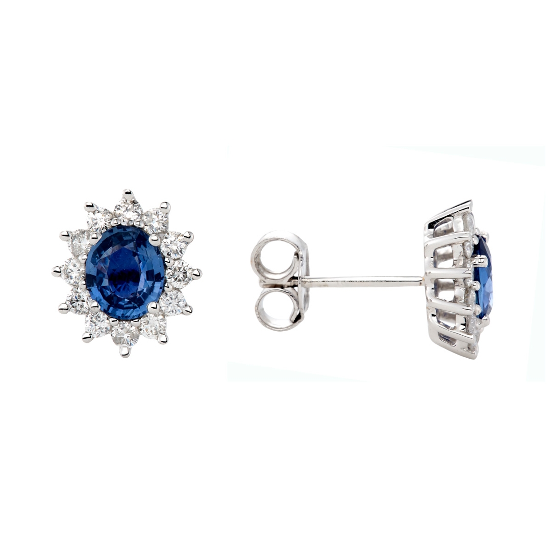 A brand-new, unused, certified pair of natural diamond & blue sapphire gemstone cluster earrings, with two oval-mixed cut blue sapphire gemstones & a cluster of brilliant cut diamonds, set in 18ct white gold.