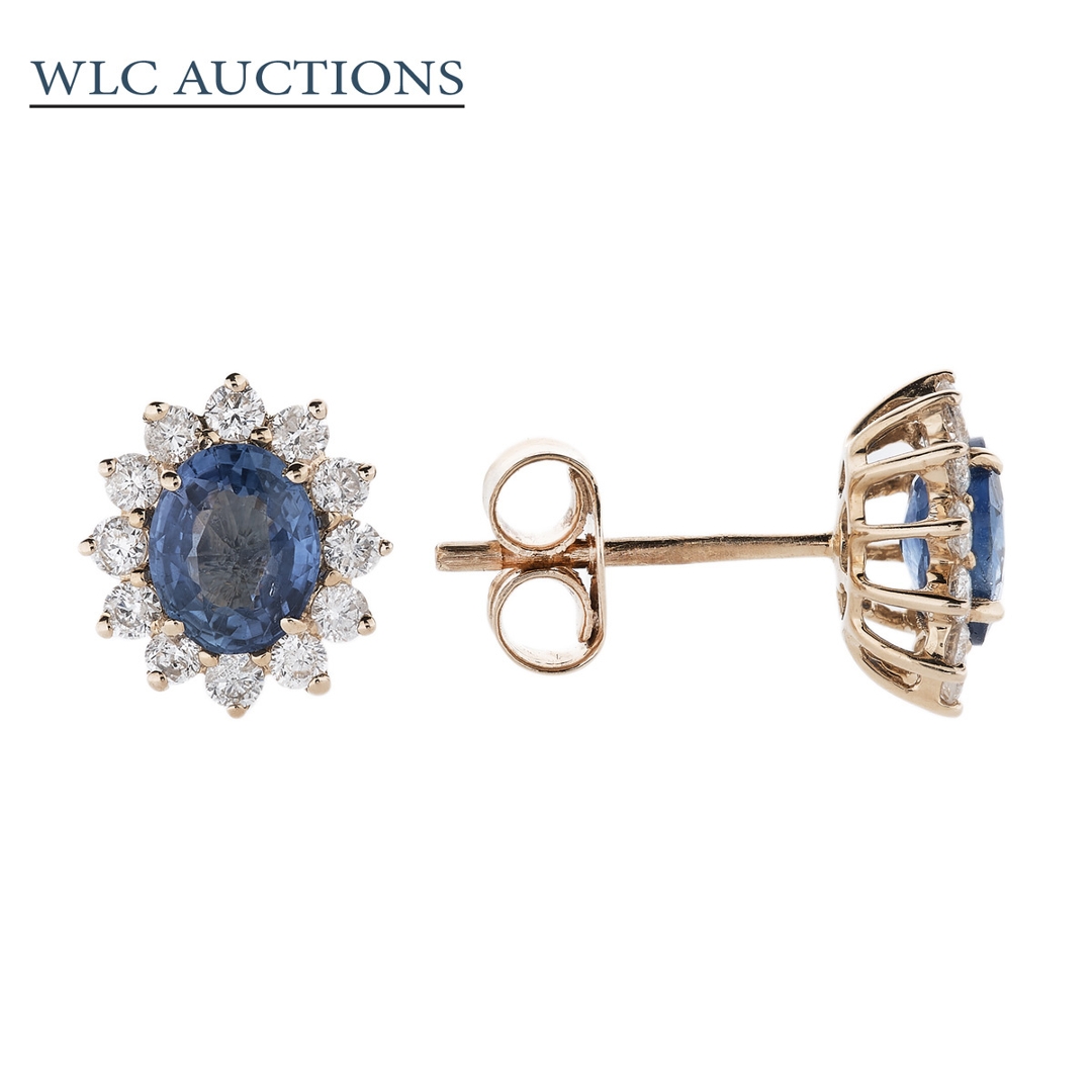 A brand-new, unused, certified pair of natural diamond & blue sapphire gemstone cluster earrings, with two oval-mixed cut blue sapphire gemstones & a cluster of brilliant cut diamonds, set in 18ct yellow gold.