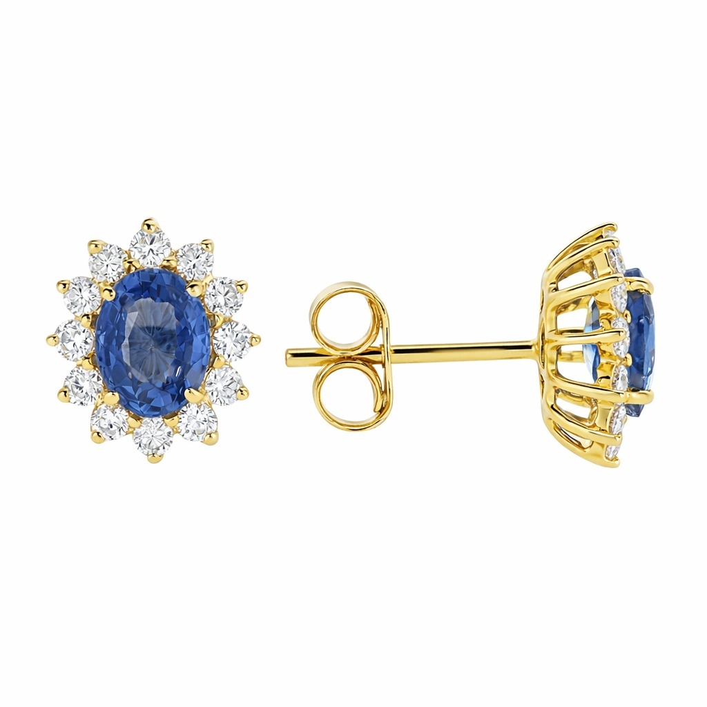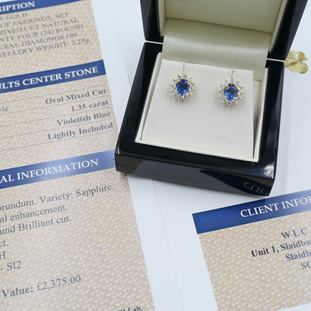A brand-new, unused certified pair of natural diamond and blue sapphire gemstone cluster earrings, beautifully crafted in 18ct yellow gold. Each earring features an oval mixed-cut blue sapphire, together weighing 1.35 carats, displaying a captivating violetish-blue hue that evokes timeless elegance and depth. Surrounding each sapphire is a delicate cluster of brilliant-cut natural diamonds, totalling 0.38 carats, with G-H colour and SI1–SI2 clarity. The warm glow of the yellow gold setting enhances the vibrant richness of the sapphires and the radiant sparkle of the diamonds, creating a luxurious harmony of colour and light that is both classic and refined.