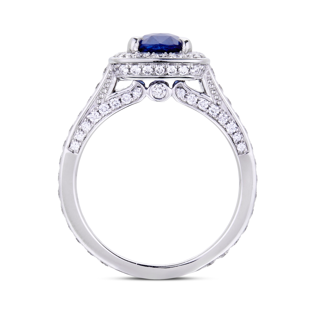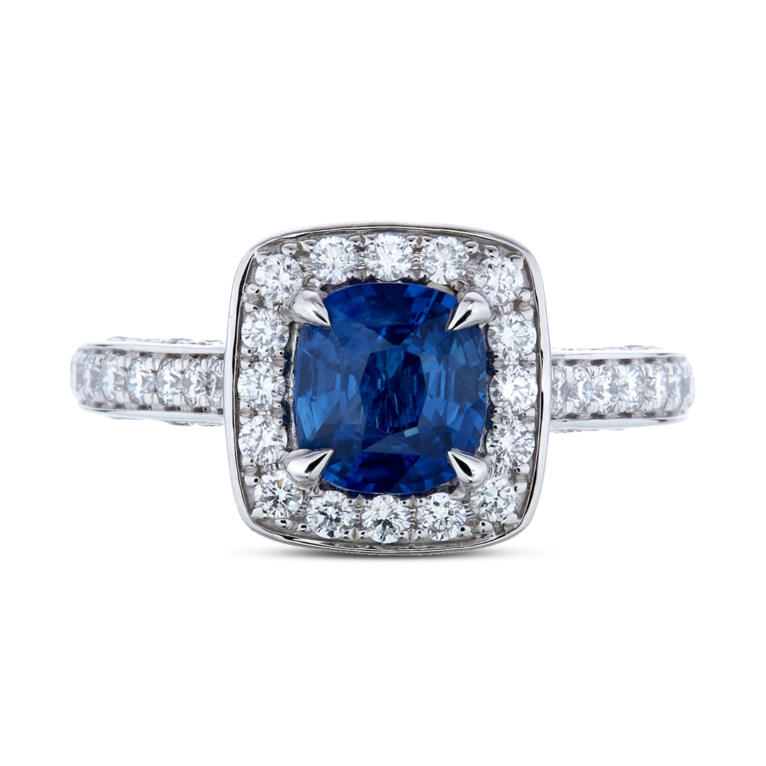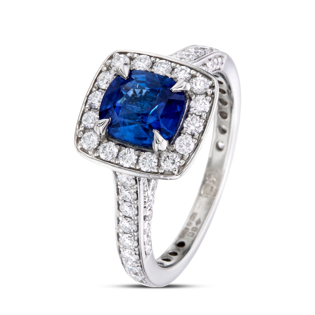 - > Natural Blue Sapphire 1.38ct & Diamond 0.99ct Cushion Shaped Cluster Ring
