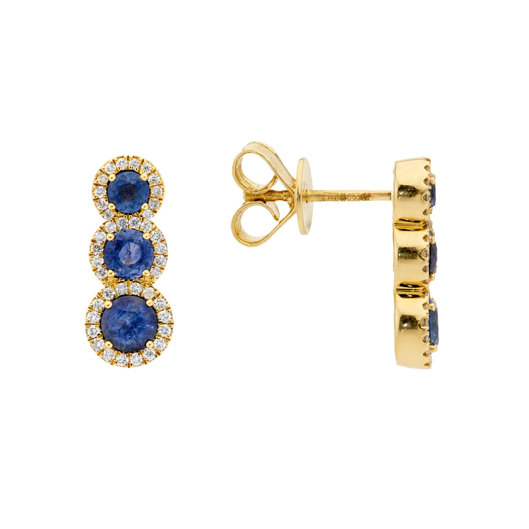A brand-new, unused, certified pair of natural diamond & blue sapphire droplet cluster earrings, with six round mixed-cut blue sapphire gemstones at the centre & a cluster of brilliant-cut diamonds in a halo setting, set in 18ct yellow gold.