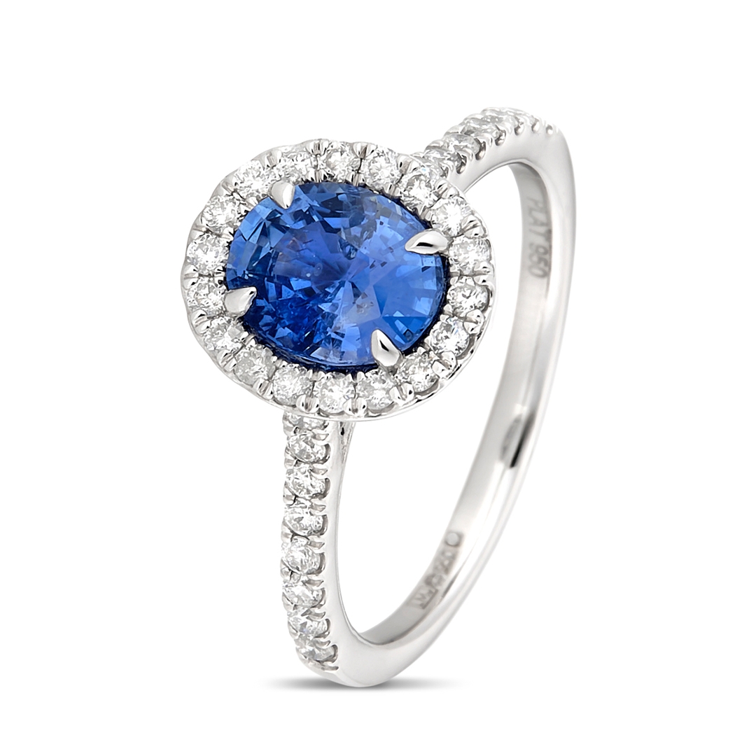 A brand-new, unused, certified natural diamond & blue sapphire gemstone oval-shaped cluster ring, set with one oval mixed-cut blue sapphire gemstone at the centre & a cluster of brilliant-cut diamonds in a halo setting & on the shoulders, set in platinum.