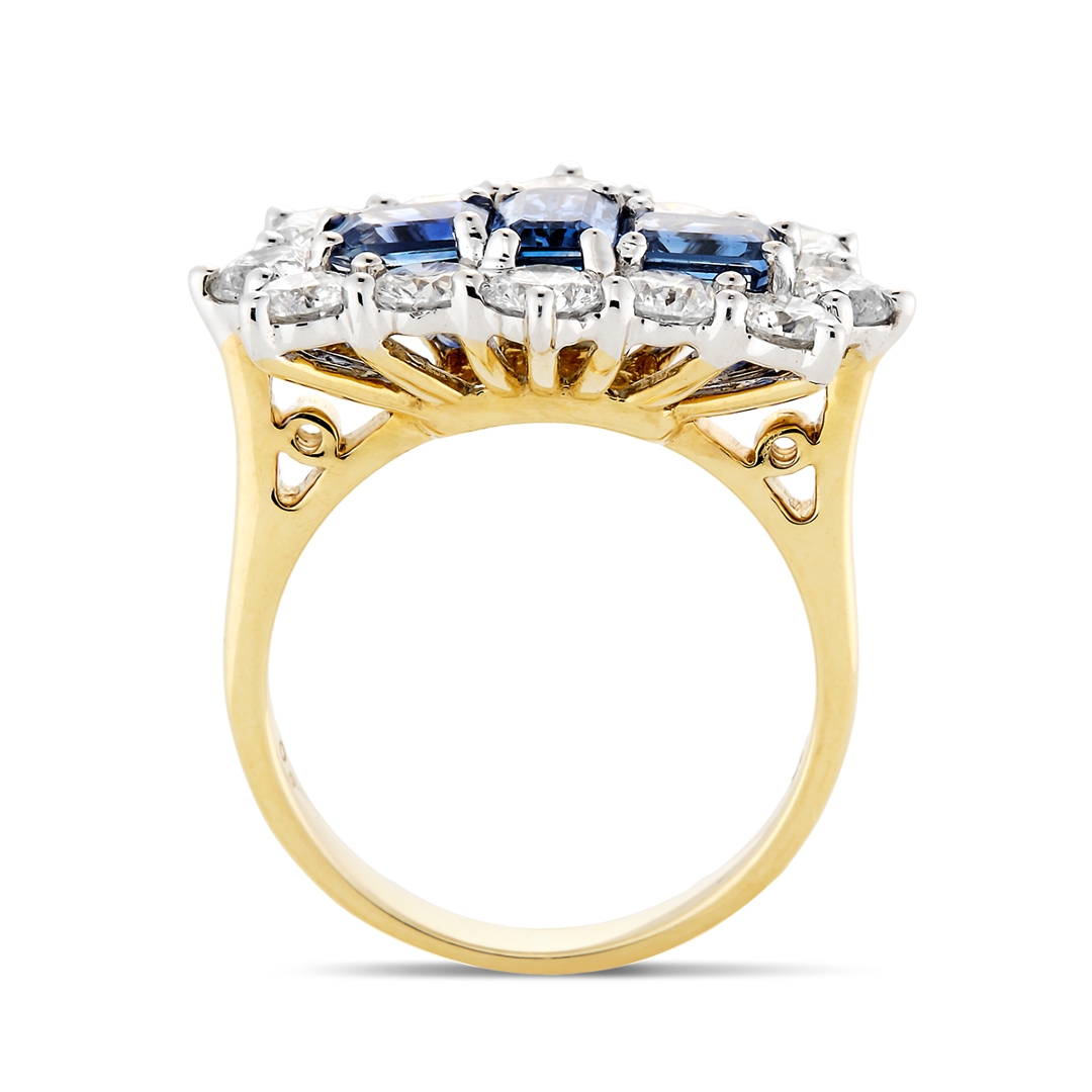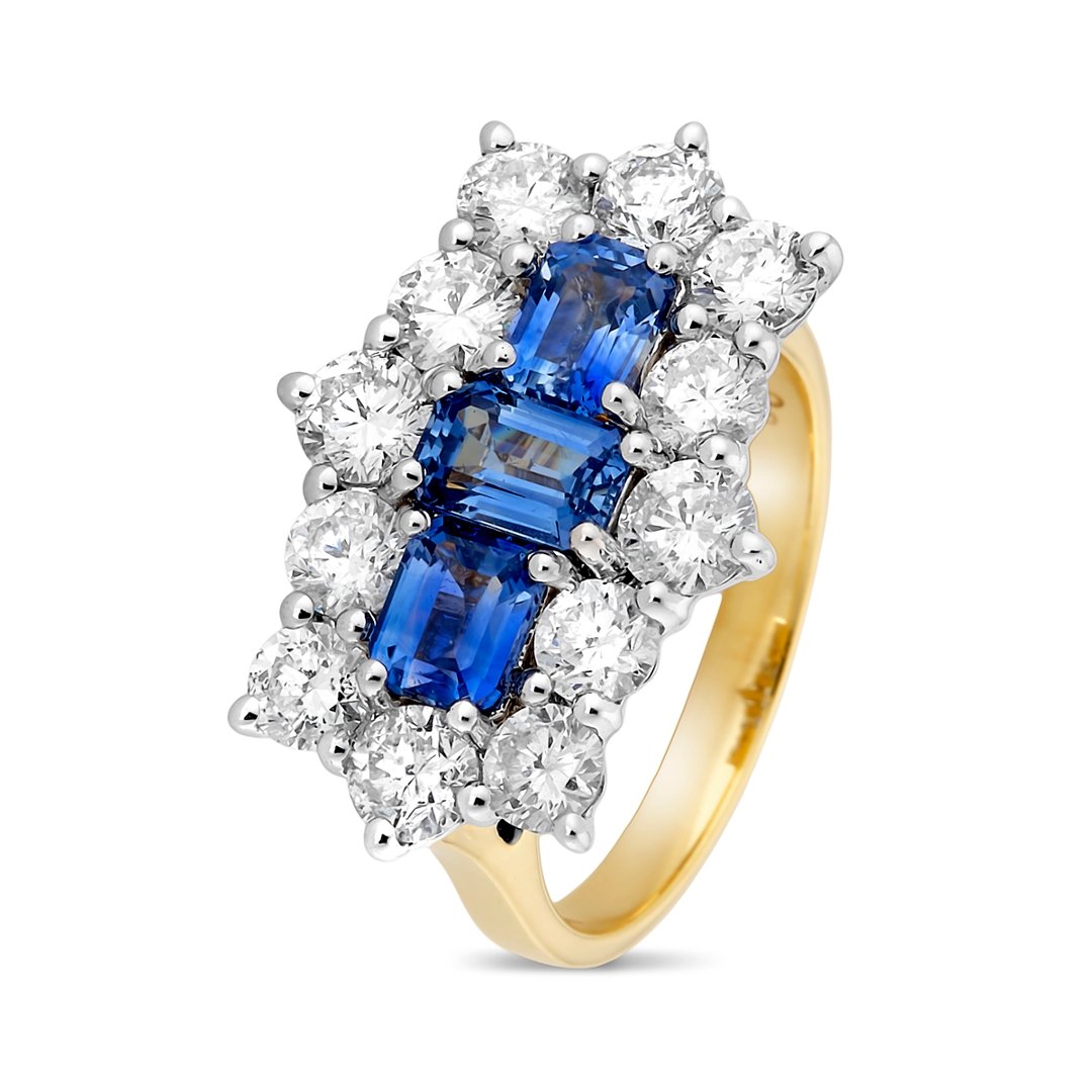 A brand-new, unused cluster ring crafted in certified 18ct yellow and white gold, this remarkable design features three octagonal step-cut natural blue sapphires weighing a combined 1.79ct. Their vivid blue tones are enhanced by a halo of twelve brilliant-cut natural diamonds, totalling an impressive 2.52ct. The dual tones of gold provide both warmth and elegance, with the sapphires offering depth of colour while the diamonds surround them with dazzling radiance. The combination of refined craftsmanship and striking gemstones makes this ring a statement piece of both style and distinction.