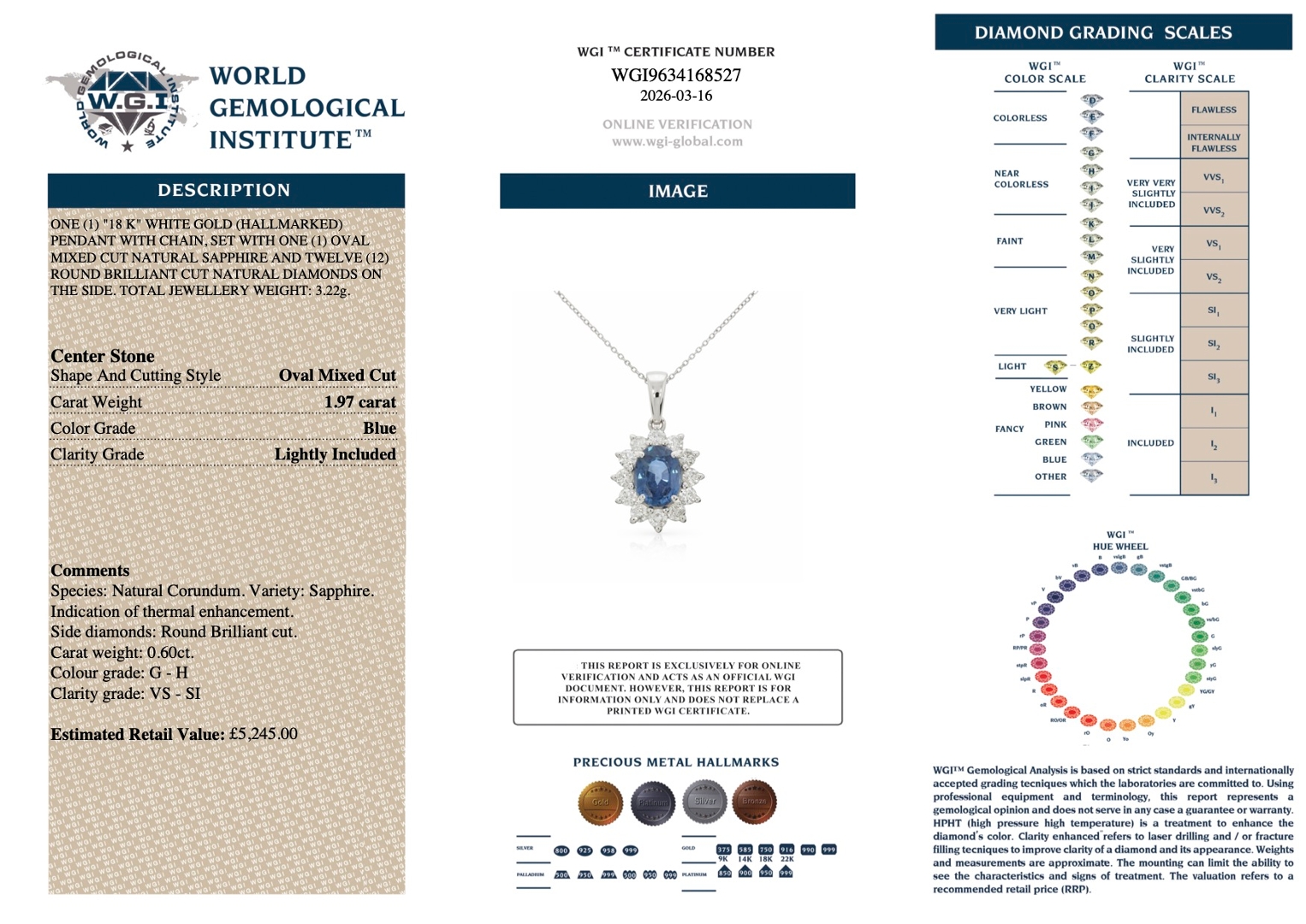 A brand-new, unused certified natural diamond and blue sapphire cluster pendant, showcasing a striking and well-proportioned design centred around a 1.97ct oval mixed-cut blue sapphire. The gemstone displays a rich, confident blue tone with excellent depth and presence, while a surrounding halo of twelve brilliant-cut natural diamonds introduces a bright, refined contrast that enhances the piece's intensity and overall visual impact.