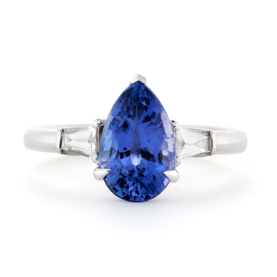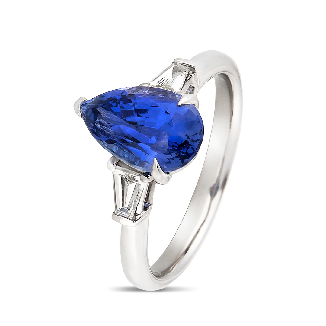A brand-new, unused, certified platinum natural diamond & blue sapphire gemstone three-stone cluster ring, set with one pear mixed-cut blue sapphire gemstone at the centre & two tapered baguette-cut diamonds to the sides.