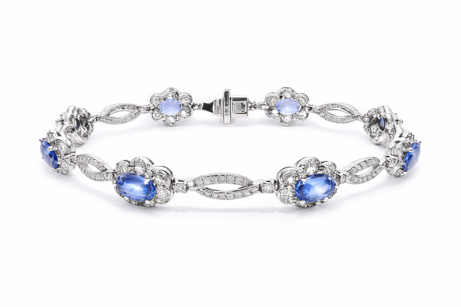 A brand-new, unused, certified natural diamond and blue sapphire flower-shaped cluster bracelet, crafted in 18ct white gold and presented in pristine condition. The centre of the bracelet is formed by a series of floral-inspired clusters, each set with oval-cut blue sapphires, totalling 4.63 carats. The sapphires are selected for their rich blue tone and natural depth, arranged to create a flowing, elegant composition across the wrist. Interspersed throughout are brilliant-cut natural diamonds totalling 2.07 carats, adding contrast, definition, and refined brilliance without overpowering the sapphires.