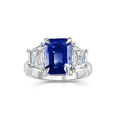 Flanking the centre stone are two beautifully matched trapezoid-cut natural diamonds, totalling 1.17 carats. Their sleek, geometric shape frames the sapphire with precision, adding a contemporary edge to the classic three-stone design. The crisp brilliance of the diamonds contrasts beautifully with the velvety sapphire, creating a harmonious and visually powerful composition.