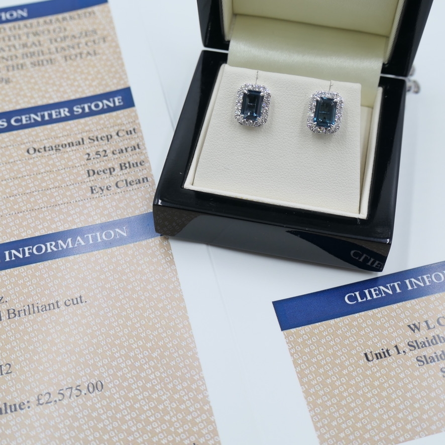 A brand-new, unused certified pair of natural diamond and blue topaz gemstone cluster earrings, beautifully crafted in 18ct white gold. Each earring showcases an octagonal step-cut blue topaz, together weighing 2.52 carats, displaying a captivating deep blue hue that exudes clarity, confidence, and sophistication. Surrounding each gemstone is a refined cluster of brilliant-cut natural diamonds, totalling 0.41 carats, with G-H colour and SI1–SI2 clarity. The diamonds’ crisp sparkle enhances the rich tone of the blue topaz, while the cool lustre of the white gold setting adds a sleek, contemporary elegance to the overall design.