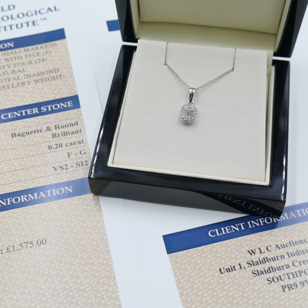 A brand-new, unused certified 18ct white gold natural diamond asscher-shaped cluster pendant, elegantly designed with five baguette-cut diamonds at the centre surrounded by a halo of brilliant-cut diamonds. Together, the 0.20ct of F–G colour and VS2–SI2 clarity stones create a captivating interplay of sparkle and symmetry. The clean geometry of the baguette diamonds beautifully complements the radiance of the round brilliants, forming a pendant that exudes modern sophistication while remaining timelessly graceful. The cool tones of white gold enhance the natural brightness of the diamonds, resulting in a pendant of remarkable refinement and elegance.