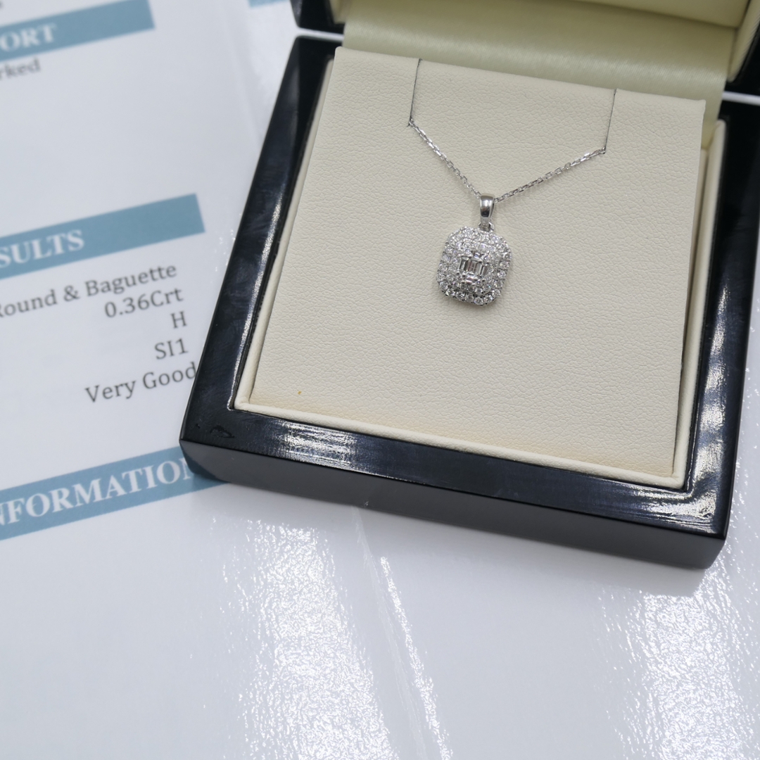 A brand-new, unused, certified natural diamond Asscher-shaped cluster pendant exudes refined elegance and timeless appeal. Beautifully designed in 9ct white gold, it features a captivating cluster of baguette-cut and brilliant-cut natural diamonds, totalling 0.36 carats. Graded H in colour and SI1 in clarity, each diamond has been carefully chosen for its radiant sparkle and clarity, reflecting the purity and sophistication that only natural stones can provide. The geometric Asscher-shaped design enhances the pendant’s brilliance, creating a mesmerising interplay of light and symmetry that effortlessly captures attention.