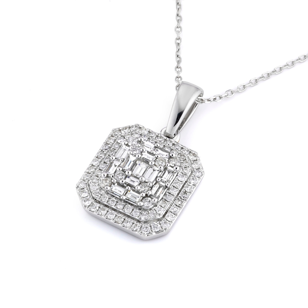 A brand-new, unused, certified 18ct white gold natural diamond asscher-shaped cluster pendant, exquisitely set with a dazzling combination of baguette-cut and brilliant-cut diamonds totalling 0.95 carats. The interplay of shapes creates a mesmerising display of sparkle and symmetry, highlighting the precise craftsmanship that defines fine diamond jewellery. With G–H colour and SI1–SI2 clarity, these near-colourless diamonds radiate a bright, crisp brilliance that contrasts beautifully with the luminous white gold setting, giving the pendant an effortlessly elegant, refined appearance suitable for every occasion.