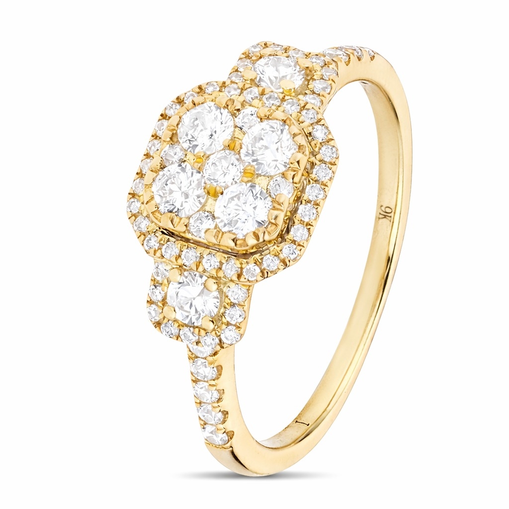A brand-new, unused, certified natural diamond Asscher-shaped trio cluster ring, set with a cluster of brilliant-cut diamonds to the centre & shoulders, set in 9ct yellow gold.