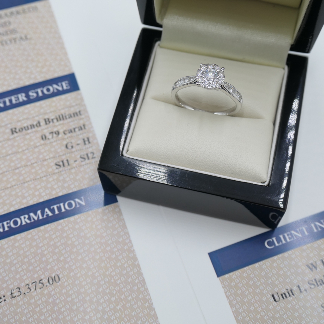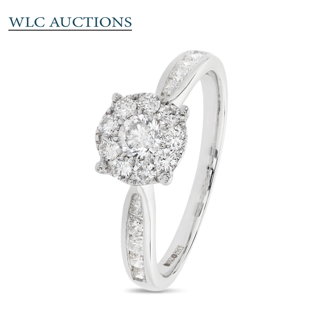 A brand new, unused, certified 18ct white gold natural diamond brilliant-shaped cluster ring, set with a cluster of brilliant-cut diamonds to the centre & shoulders.