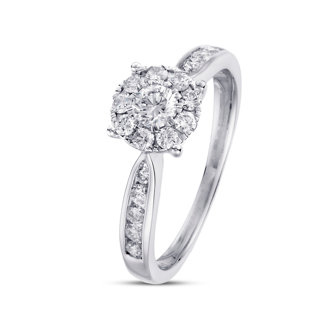 A brand-new, unused, certified natural diamond, brilliant-shaped cluster ring, set with a cluster of brilliant-cut diamonds to the centre & shoulders, in 18ct white gold.