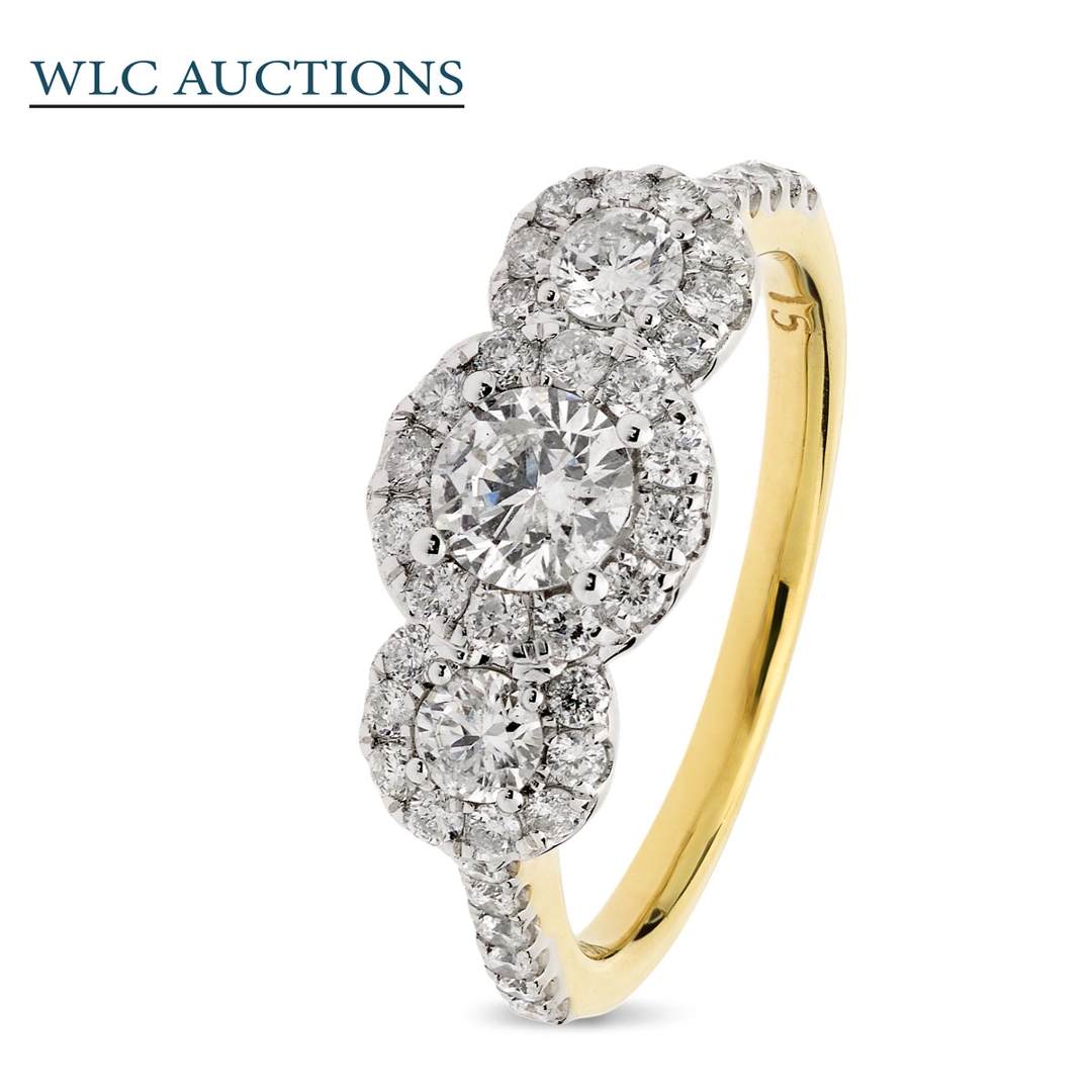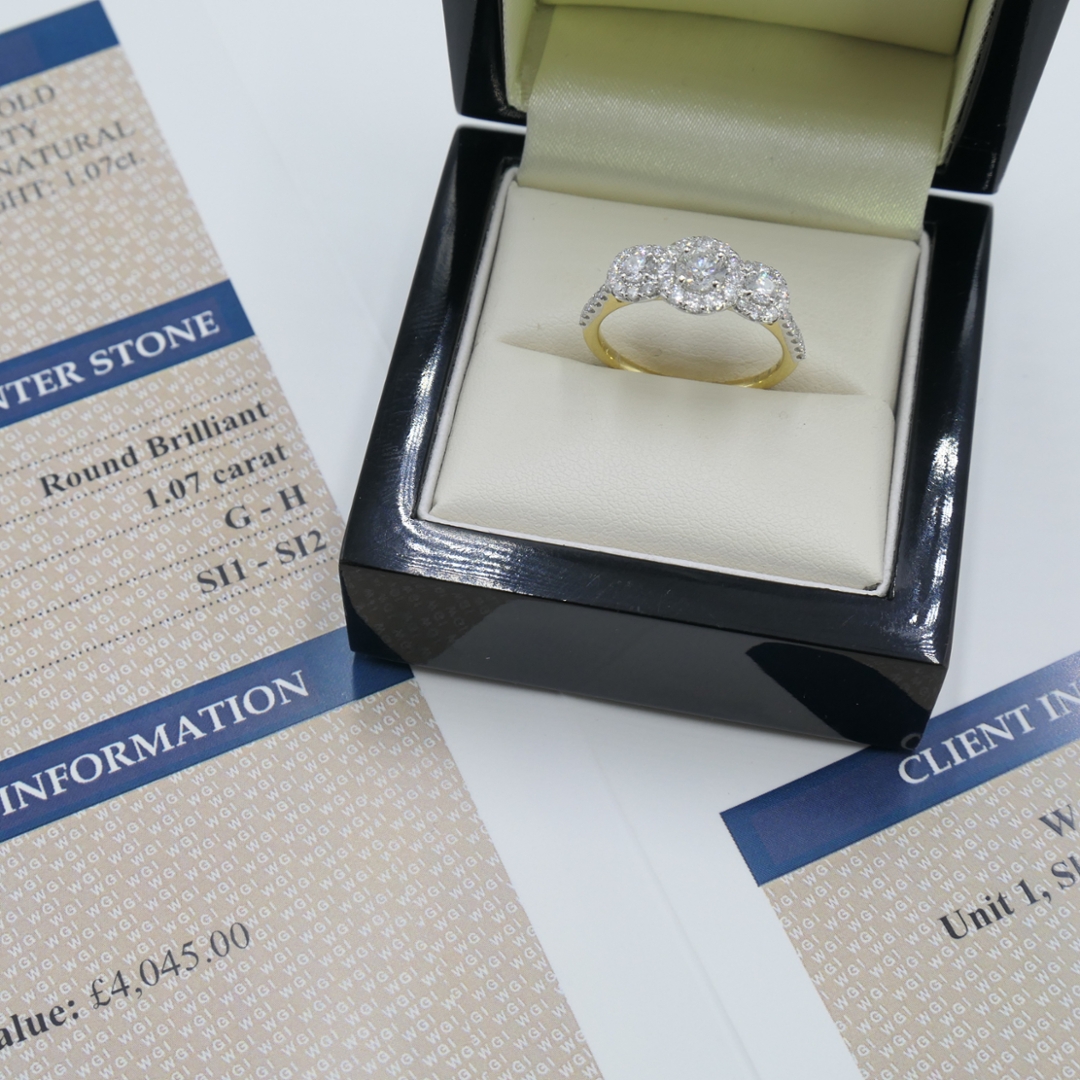 A brand-new, unused certified ring, crafted in 18ct white and yellow gold. This exquisite trio cluster ring features three brilliant-cut diamonds at the centre, each surrounded by a halo of smaller brilliant-cut diamonds. The design extends to the shoulders, adding more diamonds to the brilliance and sparkle. The total diamond weight is 1.07ct, with a clarity range of SI1-SI2 and a colour grade of G-H, ensuring both beauty and exceptional quality. Weighing 3.52 grams.