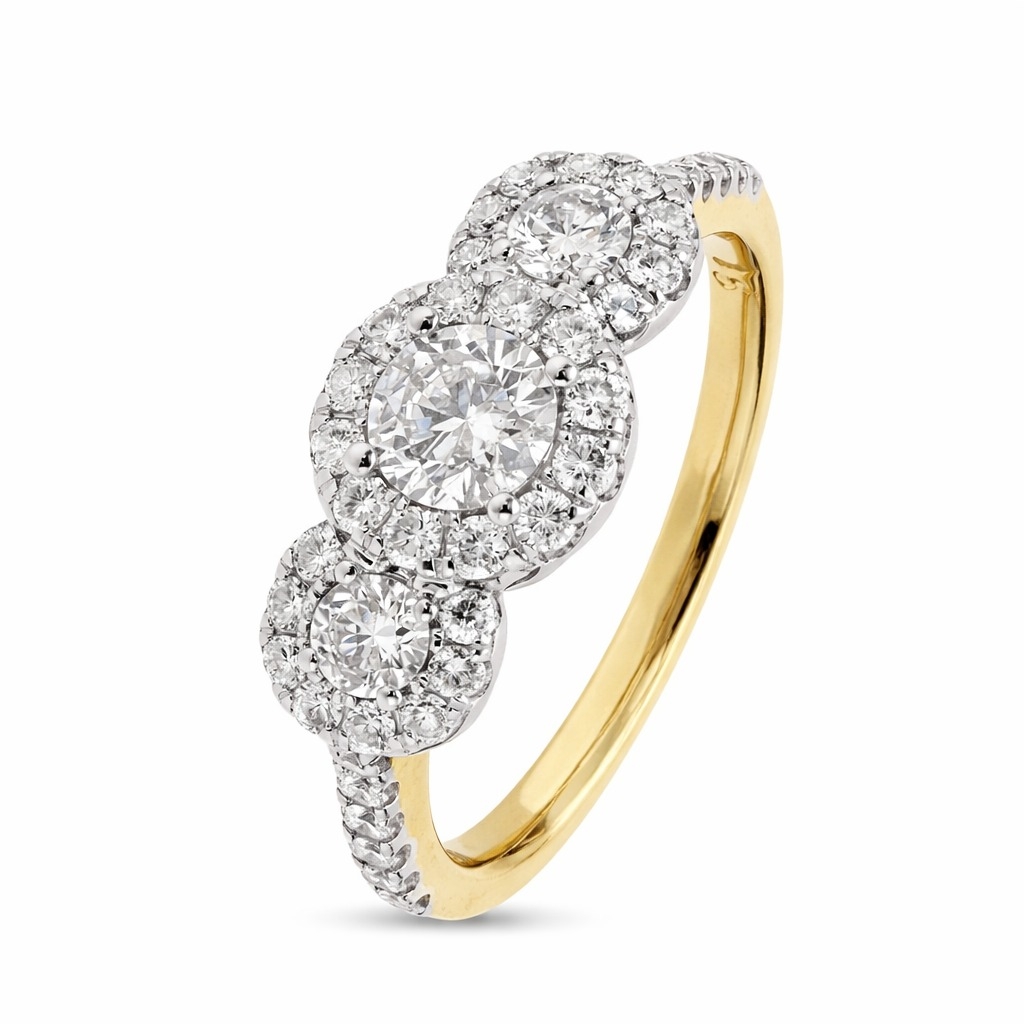 A brand new, unused, certified natural diamond brilliant-shaped trio cluster ring, set with three brilliant cut diamonds to the centre & a cluster of brilliant-cut diamonds in a halo setting & to the shoulders, set in 18ct white & yellow gold.