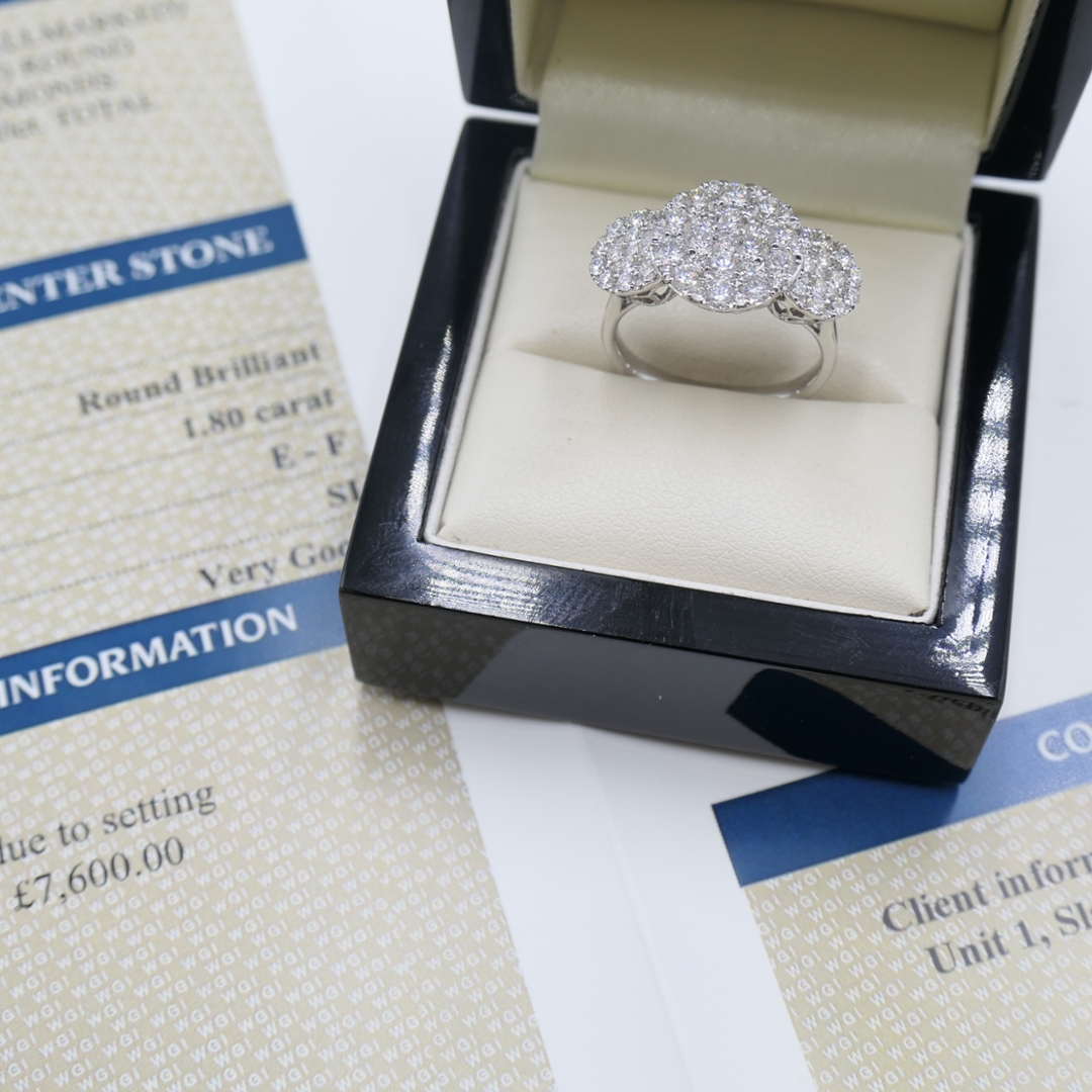 A brand-new, unused, certified 18ct white gold trio cluster ring is a stunning testament to the enduring value and beauty of natural diamonds. Featuring a remarkable total diamond weight of 1.80 carats, the brilliant-cut diamonds are expertly arranged in a classic trio cluster design, offering a breathtaking display of brilliance and fire. Crafted with precision, the diamonds are graded SI for clarity and E-F for near-colourless perfection, ensuring exceptional sparkle and quality.