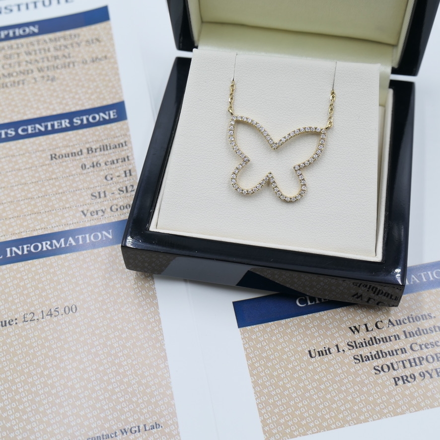 A brand-new, unused 9ct yellow gold pendant that embodies elegance and natural beauty in a charming butterfly design. This exquisite piece is intricately set with a cluster of sixty-six round brilliant-cut natural diamonds, totalling 0.46 carats. Each diamond, graded G–H in colour and SI1–SI2 in clarity, has been precisely arranged to create a delicate sparkle that enhances the butterfly motif's graceful silhouette. The warmth of yellow gold perfectly complements the diamonds' near-colourless brilliance, resulting in a pendant that radiates sophistication and timeless charm.