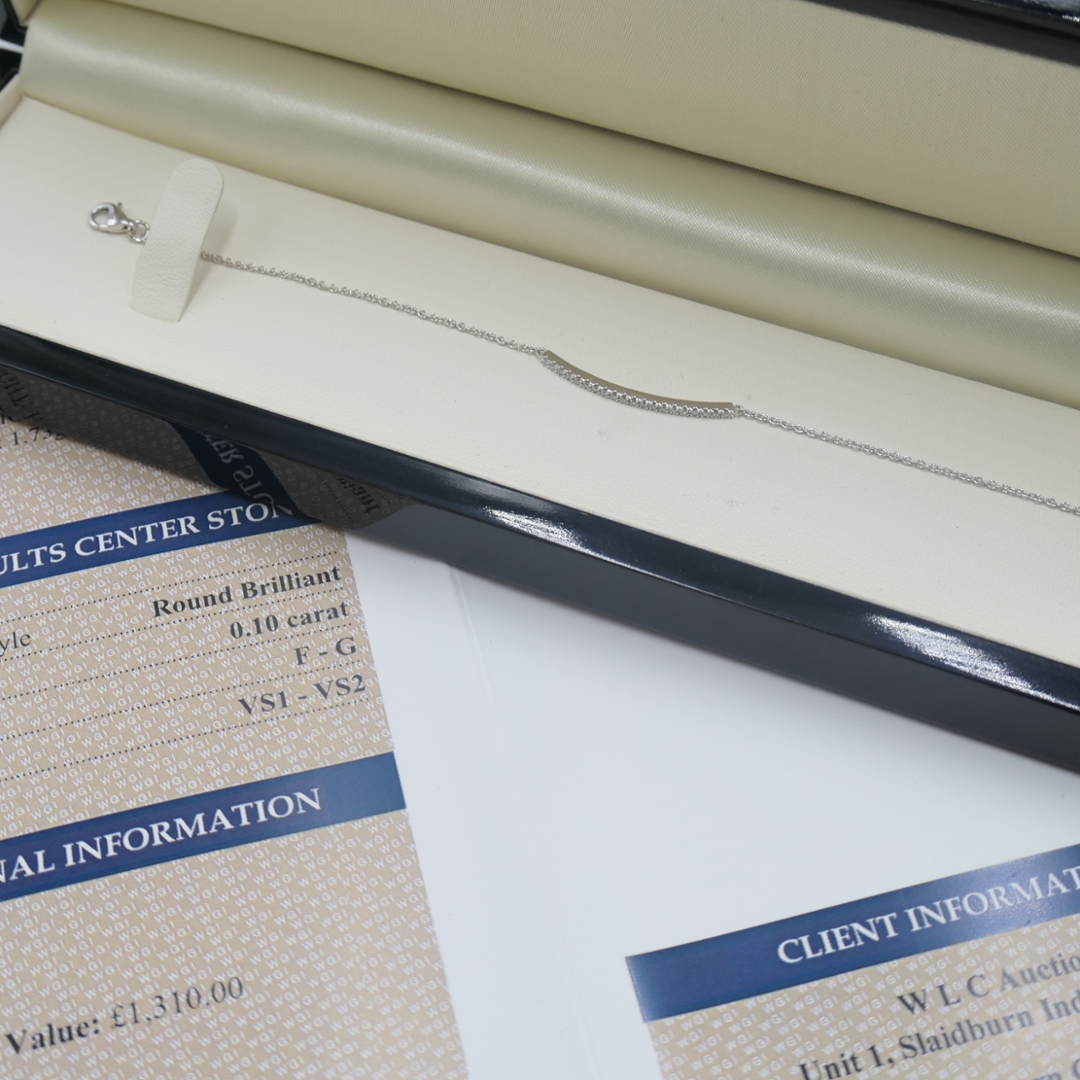 A brand-new, unused, certified 18ct white gold natural diamond chain bracelet, this refined piece is a perfect balance of subtle sparkle and timeless elegance. Set with a delicate cluster of brilliant-cut natural diamonds totalling 0.10ct, the bracelet offers a graceful shimmer that catches the light with effortless charm. The diamonds, graded between VS1 and VS2 in clarity and F to G in colour, are of exceptional quality, delivering crisp brilliance and a clean, radiant finish.