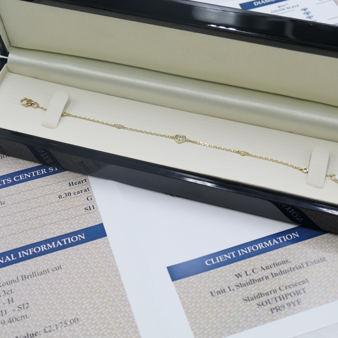 At the heart of the design is a captivating 0.30ct heart-cut diamond, selected for its SI1 clarity and exquisite G colour. This carefully cut diamond symbolises love and brilliance, making it a meaningful centrepiece. Four brilliant-cut diamonds, with a total weight of 0.13ct, complement it. They were chosen for their SI1-SI2 clarity and G-H colour. These diamonds add a delicate sparkle, enhancing the bracelet’s refined beauty.